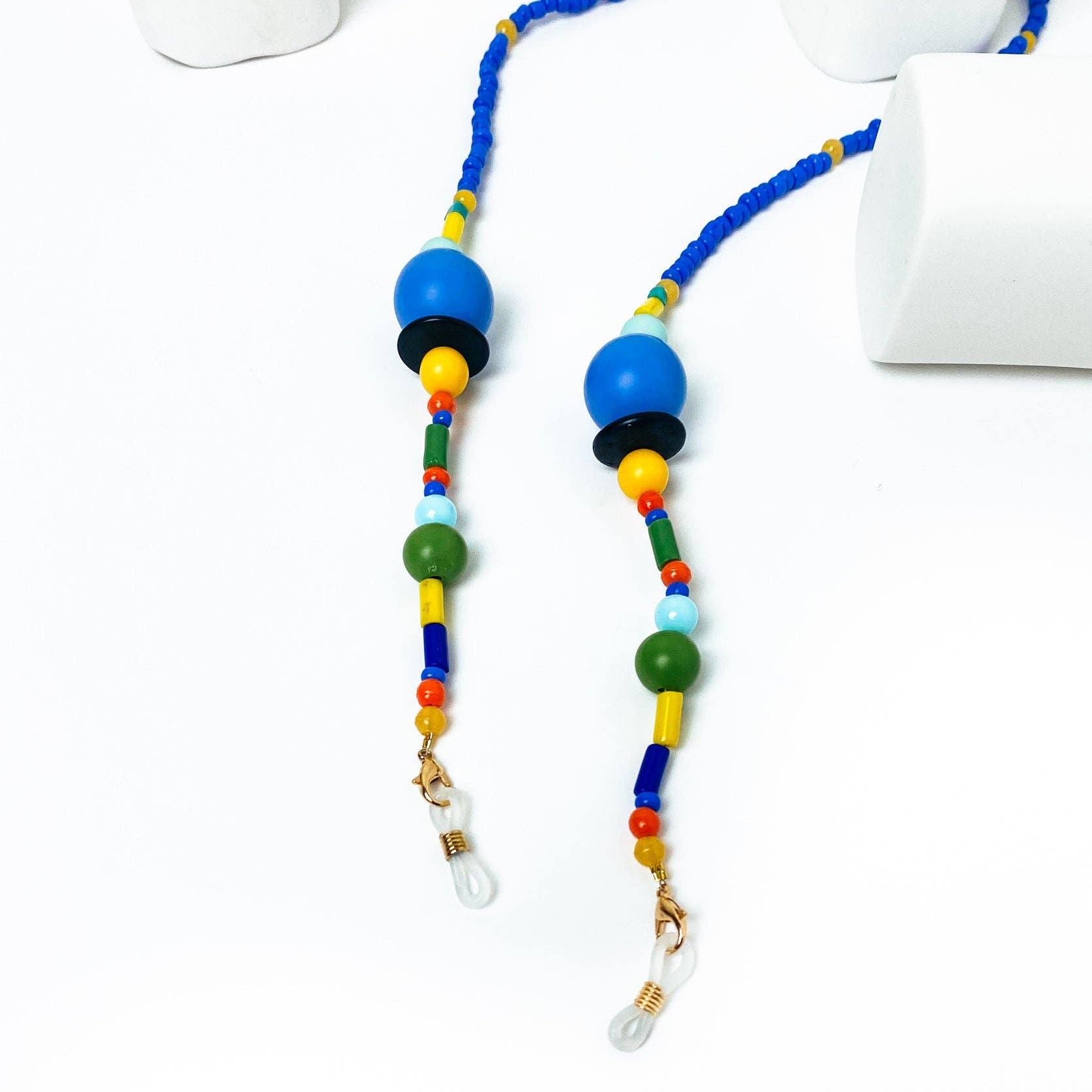 Chaîne de lunettes de soleil de couleur or en métal avec des perles colorées en bleu, blanc et or et de minuscules disques de couleur or également. MATÉRIAUX - Chaîne et disques en métal de couleur or. - Perles colorées DIMENSIONS - Vous pouvez choisir en trois dimensions différentes pour vos lunettes. (70 - 80 - 90 cm) PROTECTION - Protégez-les de l'eau, des parfums, des lotions capillaires et corporelles pour les garder brillants et brillants pendant des années.