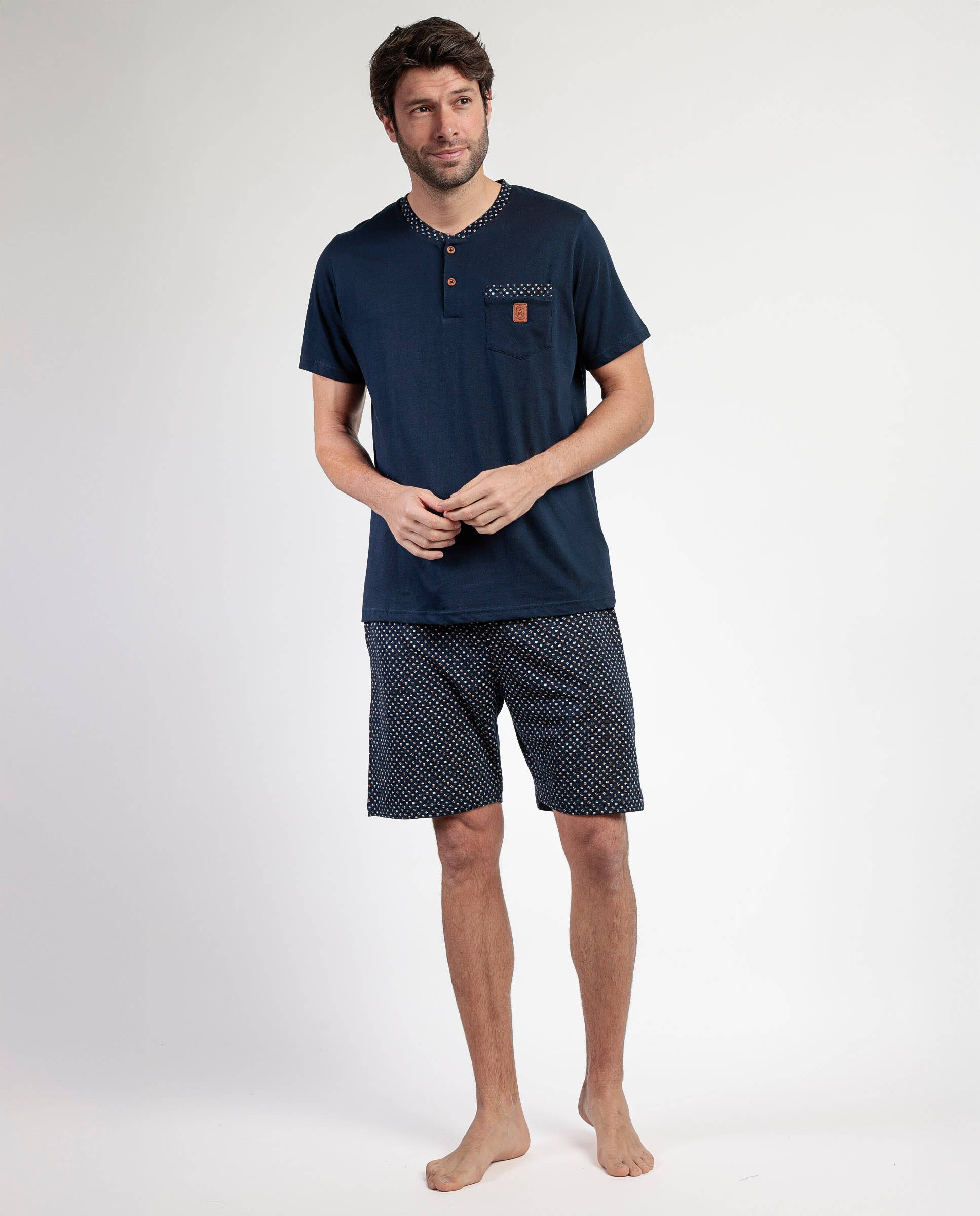 ANTONIO MIRO Pyjama rayé Bicycle Day pour homme avec manches longues * Pyjama en maille de coton, manches longues, col polo avec boutons et pantalon long. * T-shirt en maille, rayures tissées, bleu, personnalisé par la marque Antonio Miro. * Pantalon uni bleu marine en maille avec taille ajustable, poches et bords-côtes. * Tissu doux au toucher. * Design exclusif Antonio Miro fabriqué par Aznar Innova. ENTRETIEN Pour de meilleurs résultats, laver en machine selon les instructions sur l'étiquette. Lavage en machine à 30 degrés maximum. Ne pas utiliser d'eau de Javel. Laver et repasser sur l'envers. COMPOSITION 60 % coton, 40 % polyester
