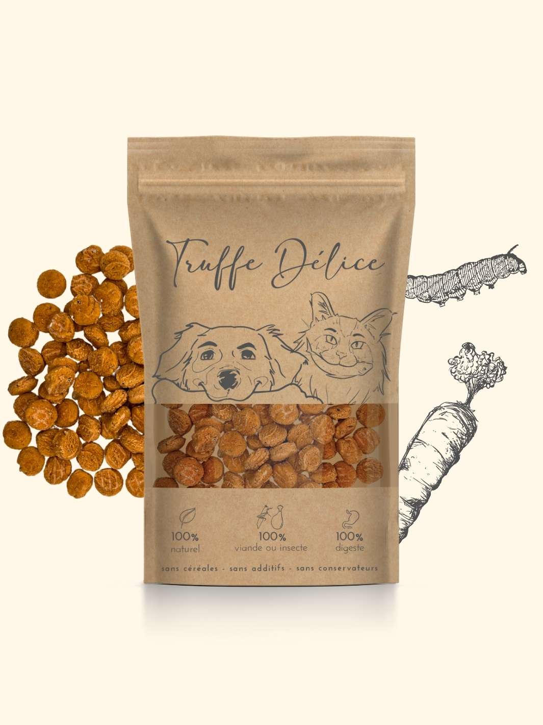 Morceaux de truite à la chair fondante pour chien et chat Offrez à votre poilu cette friandise savoureuse. Nos morceaux de truite tendre sont un régal naturel et sain, conçus pour satisfaire les palais les plus exigeants. Quels sont les bienfaits de nos morceaux de truites ? * Qualité premium locale : nos peaux de truite sont pêchées de manière durable dans les étangs du Rhône-Alpes, réputées pour leur pureté et leur richesse en ressources marines 🇫🇷 * Texture irrésistible : morceaux tendres et savoureux que votre animal adorera 😋 * Santé optimale : riche en oméga-3 pour soutenir l'immunité, le cœur et le cerveau 🧠 * Condition physique : protéines de haute qualité pour une bonne masse musculaire 💪 * Beauté du pelage : nutriments essentiels pour une peau saine et un poil brillant ✨ * Confort articulaire : propriétés anti-inflammatoires 🦴 À quels chiens conviennent nos queues de truite ? Adaptés à tous les chiens et chats, quelle que soit leur taille. Du petit yorkshire au grand saint-bernard, en passant par les félins, tous apprécieront ces morceaux faciles à mâcher et à digérer. Combien de morceaux de truite à la chair fondante puis-je donner à mon chien/chat ? Ajustez selon la taille de votre animal : * Petit gabarit : environ 4 morceaux par semaine * Taille moyenne : environ 6 morceaux par * Grand loulou : environ 8 morceaux par semaine Informations complémentaires * Composition : 100% truite * Constituants analytiques : protéines brutes 66 %, matières grasses brutes 12,6 %, cendres brutes 11,6 %, fibres brutes 0,4%, oméga 3 et 6 0,44 % * Taille de la friandise : environ 4,5 x 3,5 cm