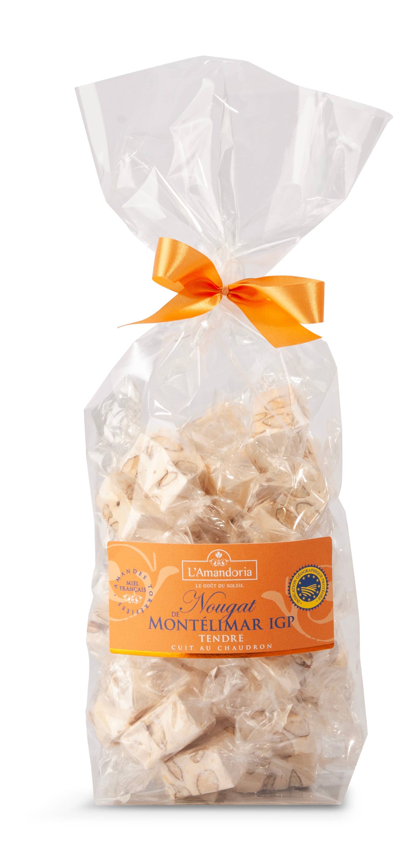 Barre de nougat tendre de 100g, arôme orange-citron. Fabrication artisanale à Montélimar Liste des ingrédients : Sucre, sirop de glucose, amandes, hosties (fécule de pomme de terre 92%, eau, huile végétale), blancs d’oeufs, arôme artificiel de vanille, arôme naturel identique de pistache, framboise, citron et orange, extrait soluble de café, colorants naturels E102, E151, E122, E124, E104 et E131. DLC : 1 an