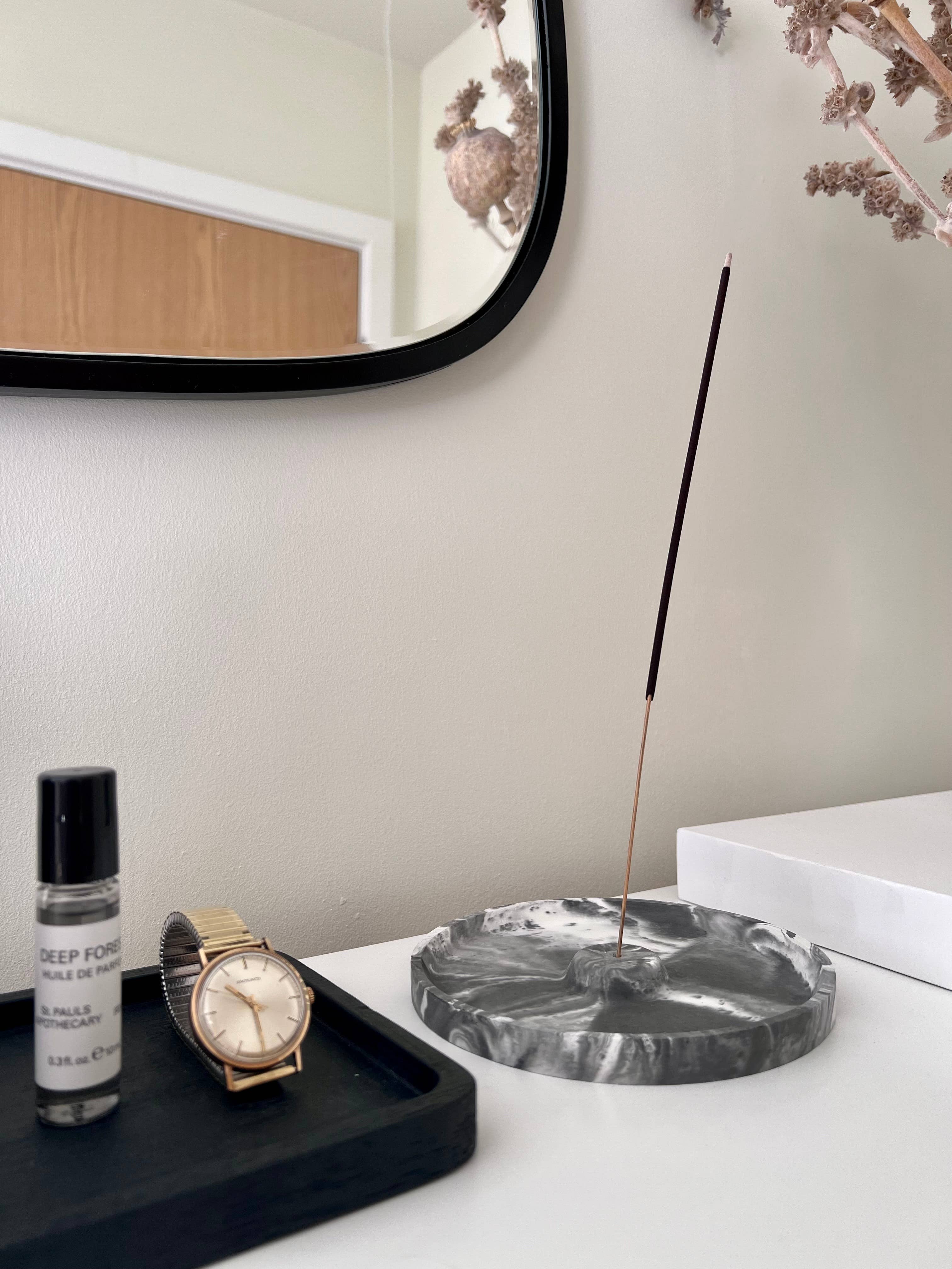 Porte-encens rond au design moderne. Entièrement fait à la main en béton, ce brûleur minimaliste présente une forme ronde épurée avec un petit trou pour maintenir le bâton d'encens à la verticale. Cette position verticale garantit une combustion lente et uniforme de l'encens tout en recueillant toutes les cendres.