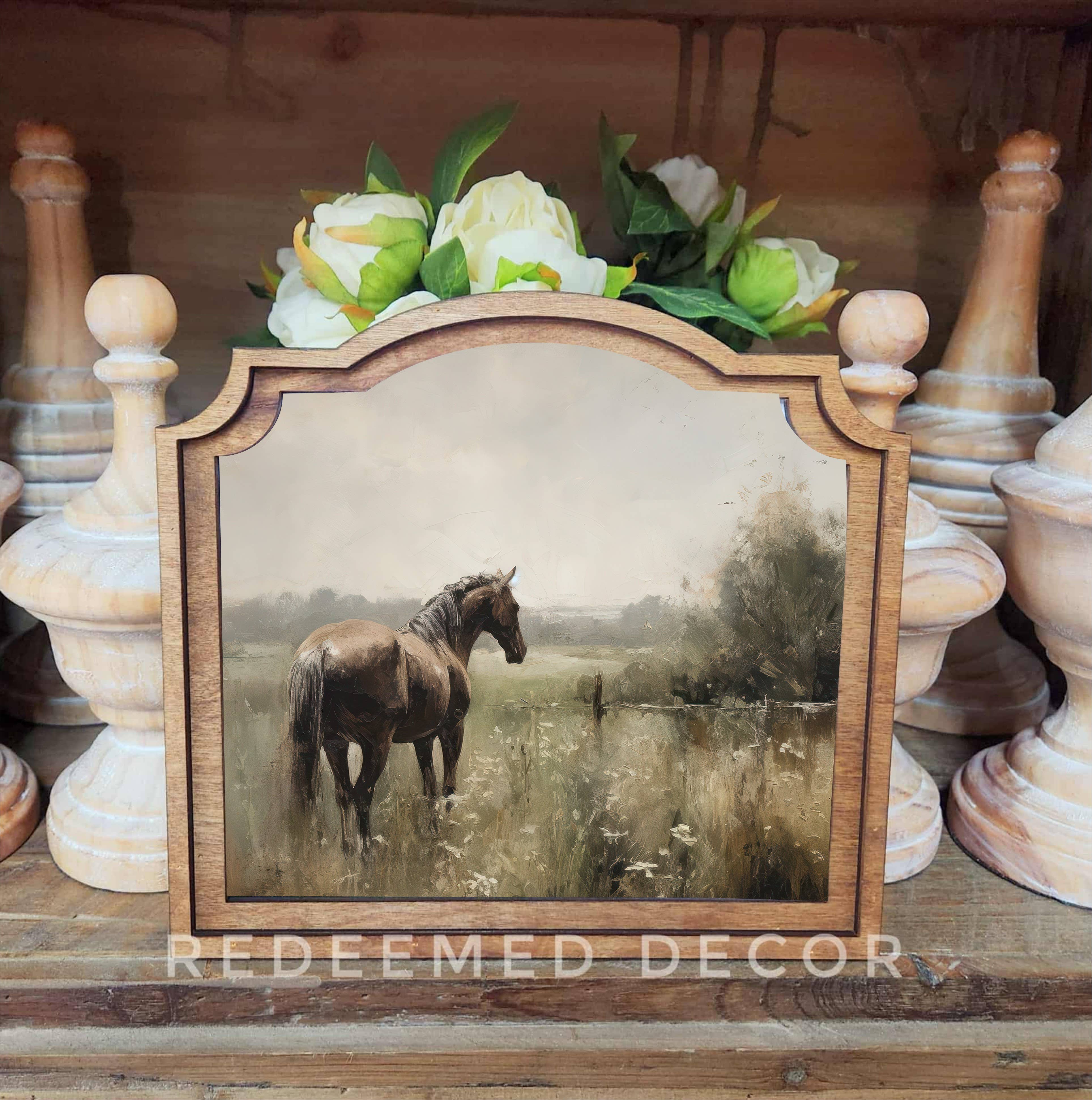 Cette œuvre d'art encadrée unique est fabriquée à la main dans l'Idaho. Elle mesure 9 pouces de hauteur sur 10 pouces de largeur. La forme personnalisée du cadre donne à la pièce un aspect vintage. L'œuvre est imprimée sur toile à l'aide de magnifiques encres pigmentées Canon. La toile est montée sur un support en bois. Le cadre supérieur est en bois de bouleau découpé au laser et teinté dans une teinte neutre Early American. L'ensemble de la pièce est léger et facile à accrocher avec une bande adhésive. (non incluse) Vous pouvez également appuyer cette œuvre contre un mur ou un autre élément de décoration pour l'exposer sur une étagère ou une table. Elle peut également être exposée sur un chevalet.