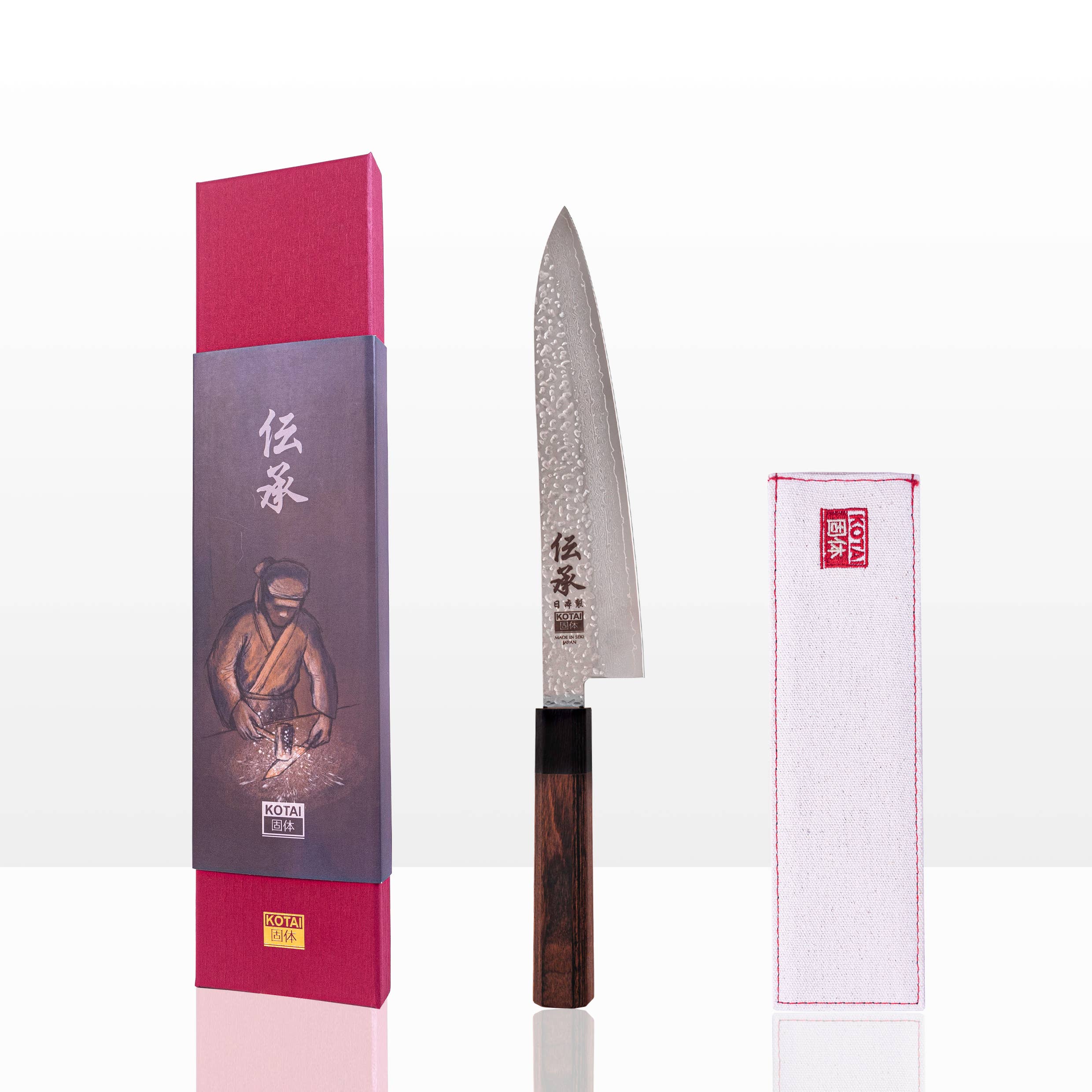 Couteau de chef Gyuto, lame de 18 cm. Le Gyuto (牛刀) est l'équivalent japonais du couteau de chef, agile et bien équilibré pour une prise en main confortable, capable de tout couper sauf les os et les aliments surgelés. Précision japonaise, robustesse occidentale. Le meilleur des deux mondes. Caractéristiques : * Fabriqué à Seki, au Japon * Acier damassé VG-10 tranchant comme un rasoir * Résistant à la rouille * Lame martelée * Demie soie * Manche en pakkawood marron * Dureté HRC : 61 +/-1 * Poids : 142g * Parfaitement équilibré pour le confort * Boîte cadeau sans plastique * Garantie à vie Description produit : Avec un profil de lame relativement plus plat qu’un couteau allemand, le Gyuto possède une lame légèrement incurvée qui permet un mouvement de balancier pour hacher et émincer sans effort, tandis que la pointe abaissée facilite les travaux de précision. Sa lame de taille moyenne (tranchant de 180 mm) est conçue pour allier praticité et polyvalence. Tous les couteaux de notre collection Densho sont équipés d’un manche octogonal en pakkawood, offrant une prise en main ferme, sûre et confortable. Au-delà de l’attrait esthétique, le martelage de la lame “Tsuchime” (槌目) créé de petites poches d’air entre la lame et les tranches de nourriture. Cette méthode ancestrale japonaise empêche la nourriture de coller à la lame pour une découpe agréable et rapide. La lame est forgée avec de l’acier VG-10, un acier Japonais de qualité supérieure qui associe une haute teneur en carbone pour la dureté et la longévité du tranchant avec la quantité optimale de chrome pour empêcher l'oxydation. L'acier Damas VG-10 à 67 couches – souvent considéré comme la référence en matière d'acier de lames – atteint une dureté de 61 HRC grâce à sa teneur en carbone de 1%. Cela permet à la lame d'obtenir un tranchant exceptionnel et de le conserver bien plus longtemps que les couteaux ordinaires. L'ajout de Chrome, Molybdène, Vanadium et Cobalt dans l'alliage rend la lame inoxydable et facile à utiliser et à entretenir. Leur demie soie – la lame s'enfonce jusqu'à la moitié de la longueur du manche – confère aux couteaux de la collection Densho leur légèreté et leurs lignes traditionnelles. Collection Densho : Fabriqué à Seki, capitale des couteaux japonais renommée pour ses lames de haute qualité et pour sees 800 ans de savoir-faire de forgeron, chaque couteau KOTAI Densho est un symbole de l'artisanat culinaire minimaliste, offrant une expérience de coupe aussi raffinée que fonctionnelle.