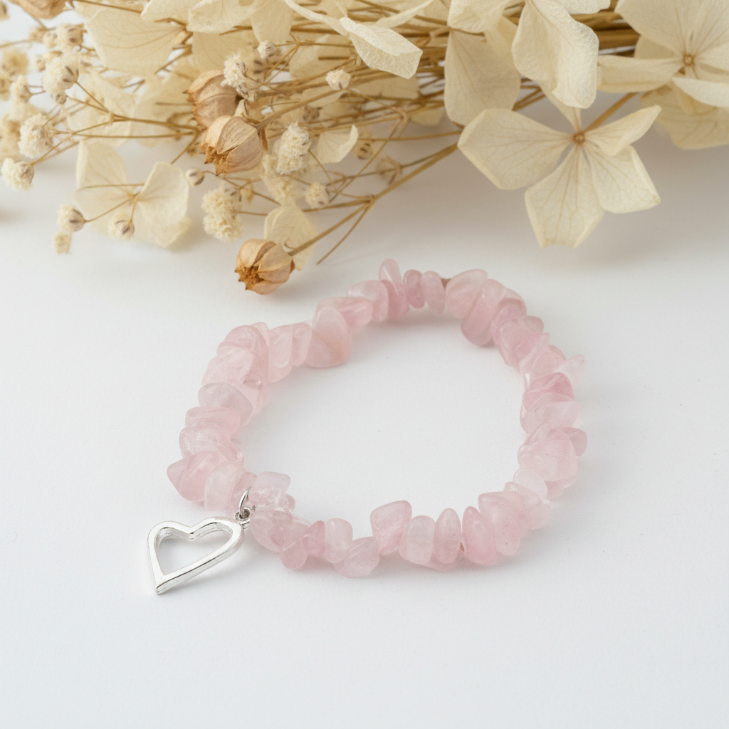 Bracelet élastique en pierres de quartz rose avec pendentif cœur