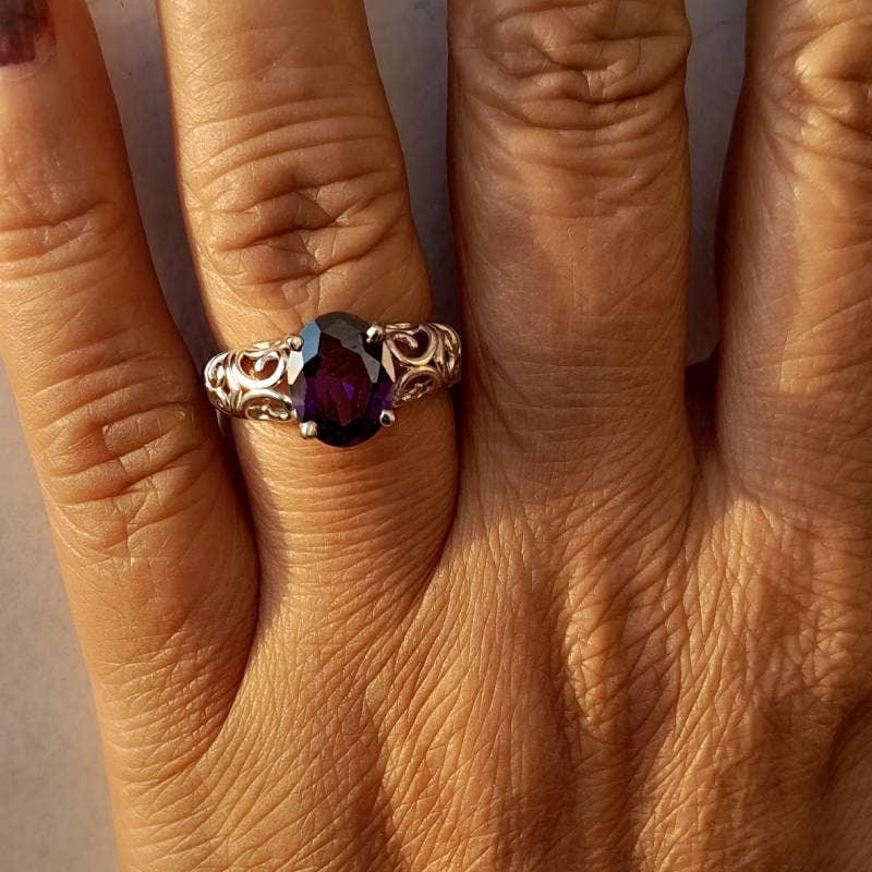 Pierre principale : Améthyste - 1CT Ovale (5x4mm) Pierres latérales : 1ct Améthyste rond, 6 CT Topaze blanche Total des pierres : 11 Poids net : 2,20 grammes Ces bagues sont également disponibles en 9K, 10K et Platine. Cliquez sur le bouton 'Contactez-nous pour un devis' si vous souhaitez connaître plus de détails tels que MOQ, délai de livraison, points de prix, etc. Nous réalisons également des commandes de design personnalisé pour nos clients. Si vous avez un design en tête que vous aimeriez voir prendre vie, contactez-nous. Nous serions ravis de vous aider.