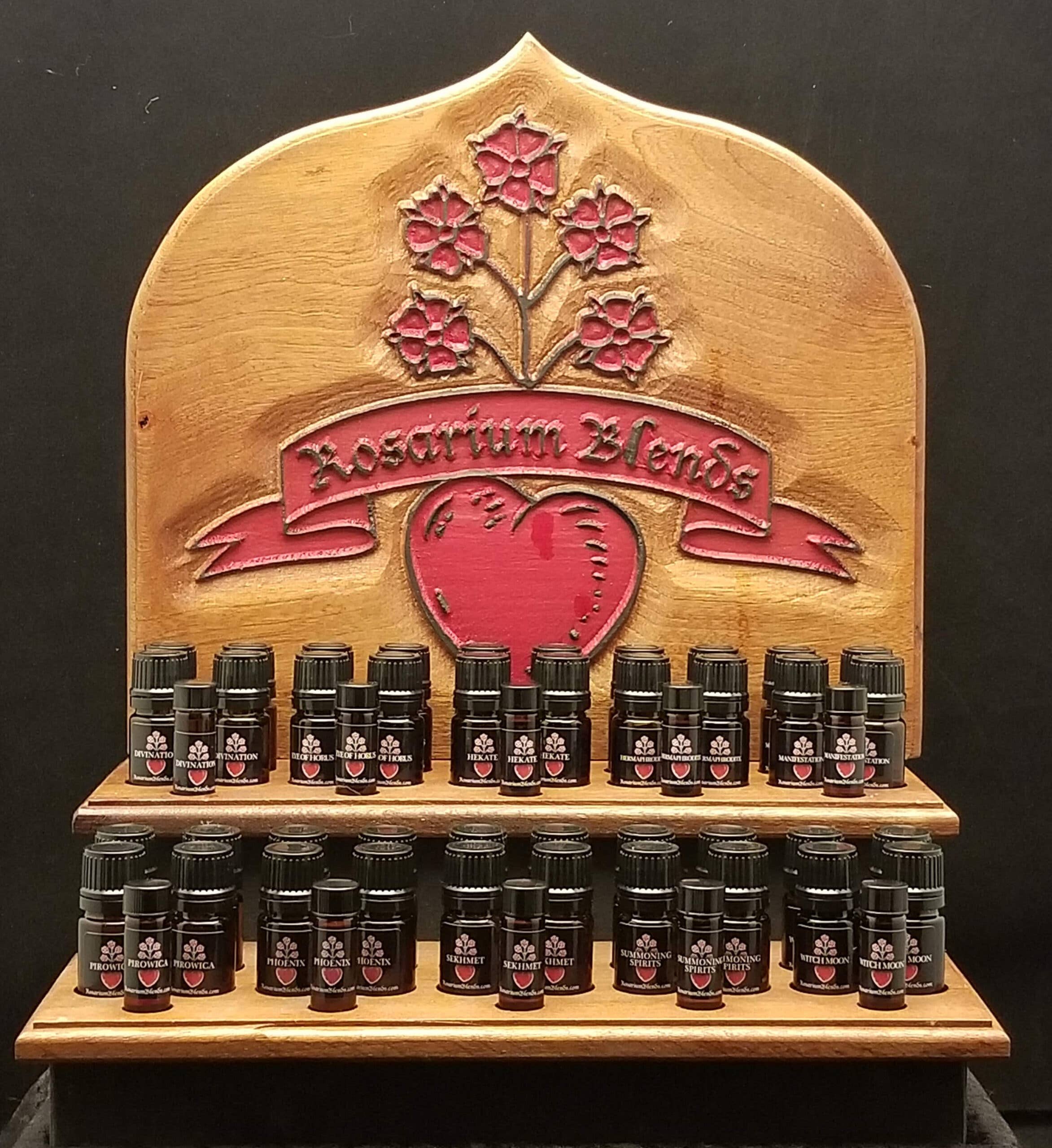 Le présentoir rempli comprend cinq bouteilles de 5 ml de chaque mélange d'huiles essentielles, dont dix : Divination, Eye of Horus, Hekate, HermaPhrodite, Manifestation, Pirowica, Phoenix, Sekhmet, Summoning Spirits et Witch Moon. (Consultez notre collection d'huiles essentielles pour plus de détails sur chaque mélange d'huiles). REMARQUE : PLUSIEURS AUTRES MÉLANGES NE SONT PAS INCLUS DANS CE PRÉSENTOIR DE BASE. VOUS RECEVREZ DES ÉCHANTILLONS DES AUTRES. Ou si vous souhaitez en échanger un ou deux, envoyez-moi un message avec votre commande. Le prix de gros de chaque flacon est de 10$ l'unité (5 ml d'Eurodropper) ou de 11$ l'unité (5 ml de rollon), avec une valeur au détail suggérée de 20$ ou 22$ par flacon respectivement. L'écran rempli comporte une fente avant destinée à servir de « testeur » pour chaque mélange à échantillonner (cliquez sur la photo pour l'agrandir). Remarques : *Rosarium Blends n'est pas responsable du remplissage de vos testeurs. Veuillez acheter le flacon de 5 ml lorsque vous avez besoin d'une recharge.