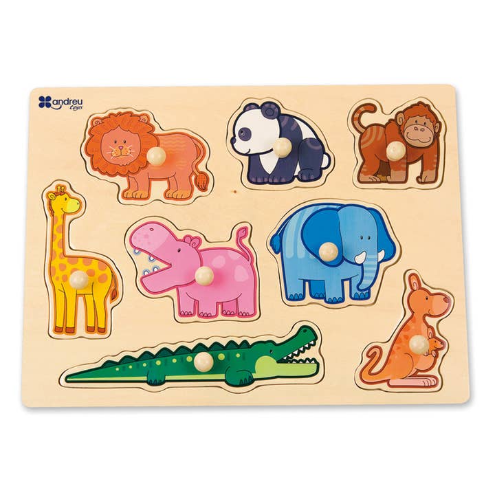 Puzzle de 8 pièces avec des dessins d'animaux de la jungle. Pivots en bois.