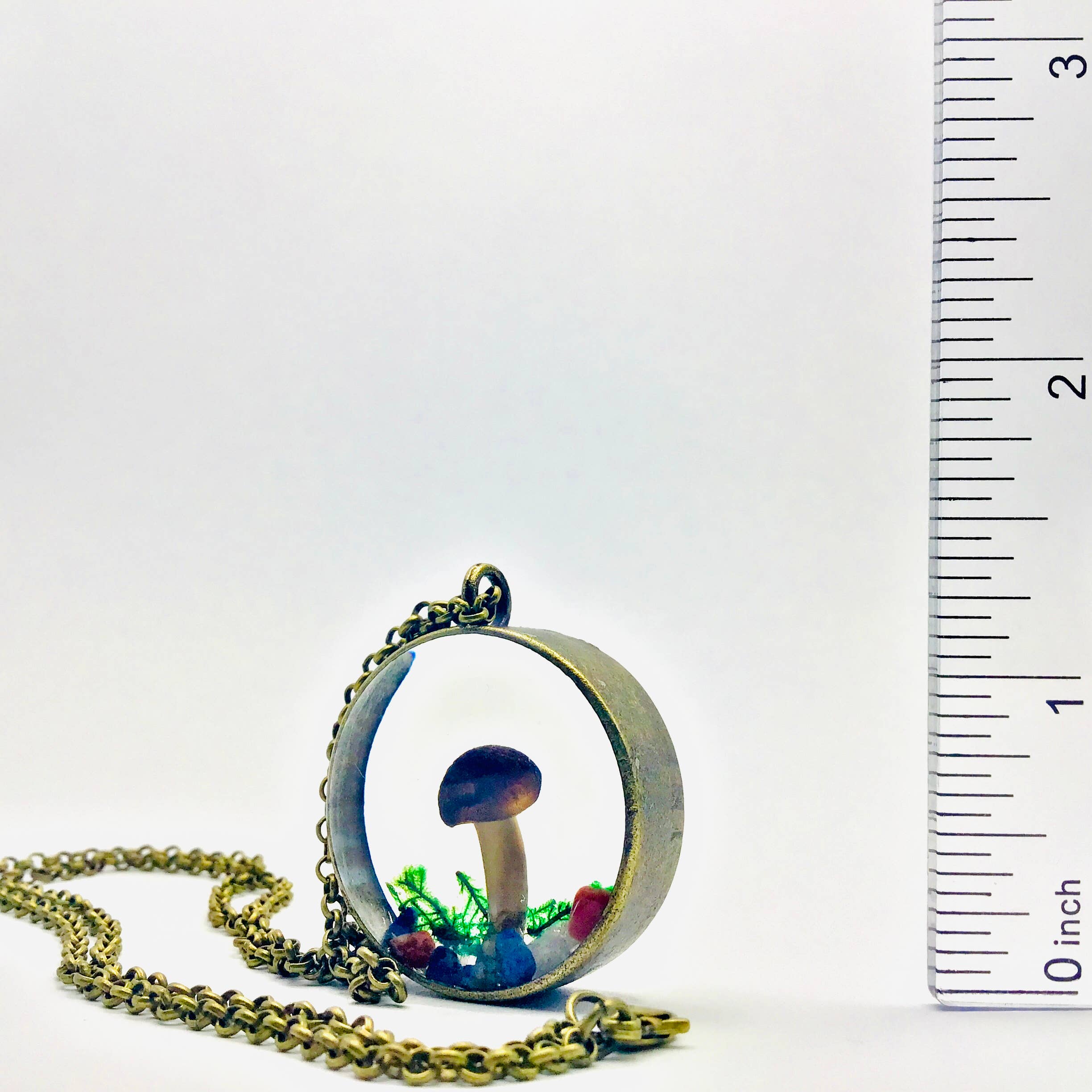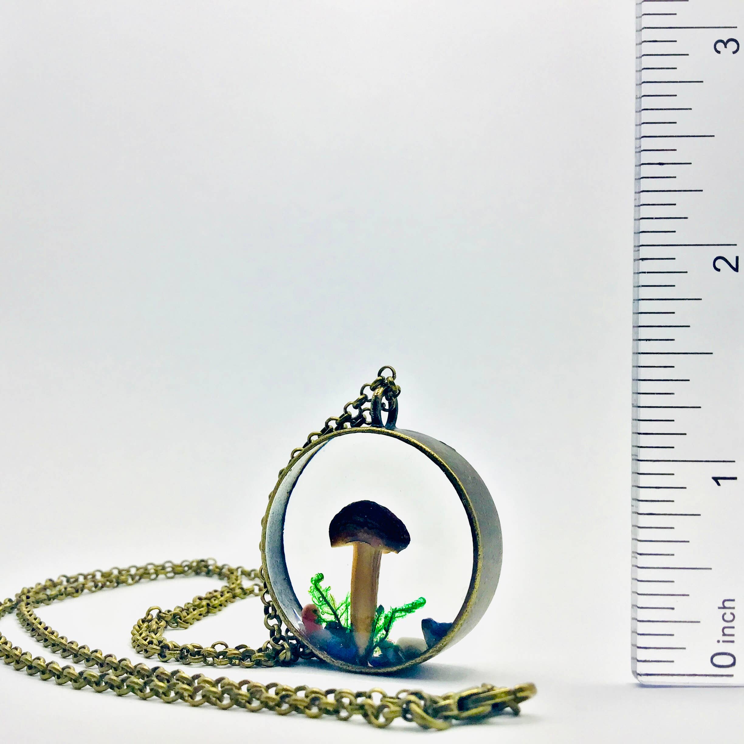 C'est un vrai champignon qui a été préservé et encapsulé dans un pendentif en résine. Nous l'avons soigneusement préparé pour un affichage permanent, avec de la mousse et des minéraux colorés. Dans la nature, les champignons émergent généralement après la pluie, puis disparaissent en quelques jours. Cela donne l'impression d'être figé dans le temps, juste au moment où le champignon a germé. Vous pouvez le porter comme bijou ou l'accrocher comme décoration dans votre maison. Fait main dans le New Hampshire chez Fungus Farm LLC, en utilisant des champignons récoltés de manière durable. Cette curiosité unique de champignon ferait une merveilleuse décoration ou un cadeau pour un amateur de nature. Expédié attaché à une carte en papier, pour l'affichage en magasin ou la présentation de cadeaux. Le cadre en alliage de laiton mesure environ 1,25" de large x 0,5" d'épaisseur. Il est suspendu à une chaîne en alliage de 20" avec un fermoir mousqueton.