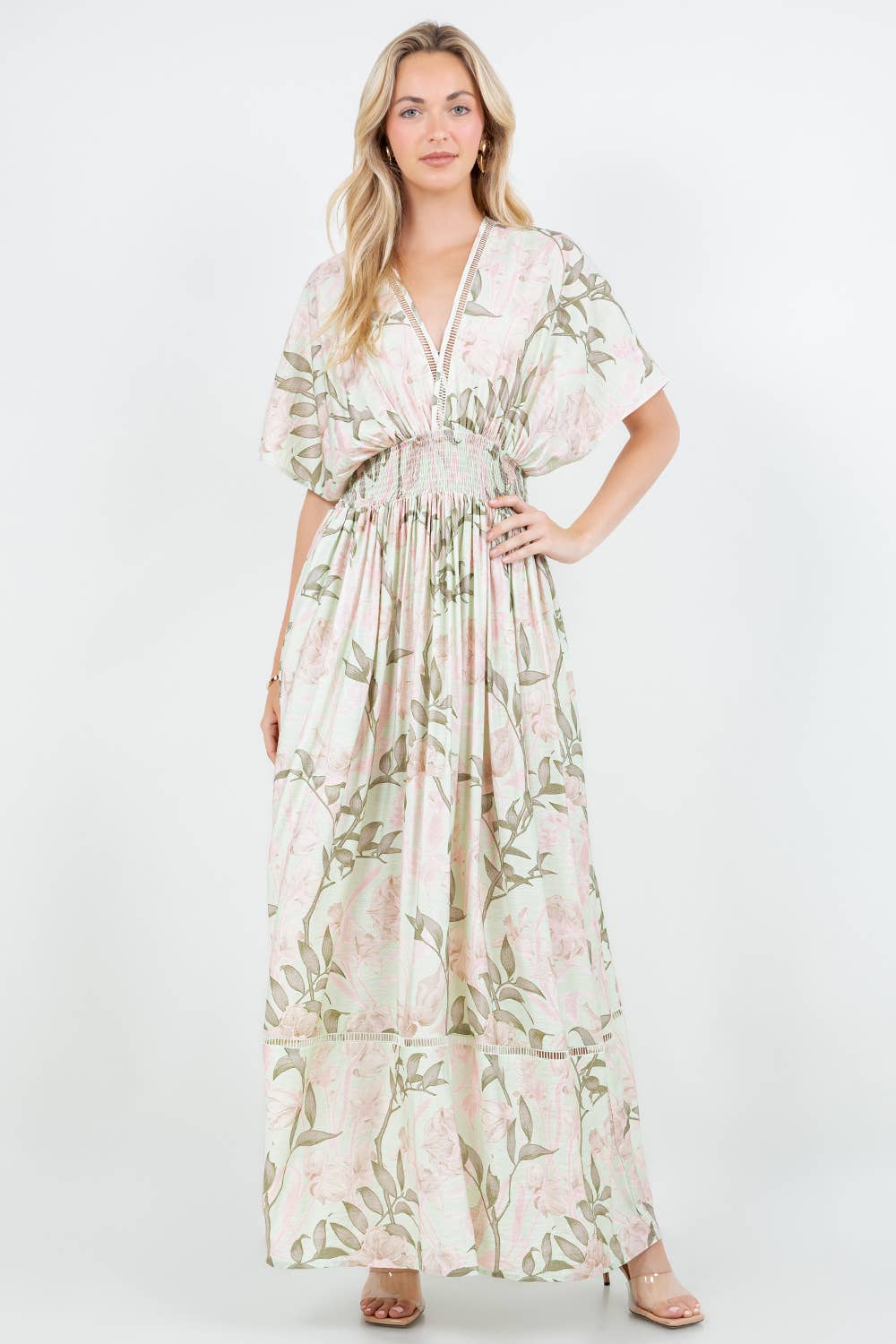 Robe longue volantée à col en V et à manches courtes en dentelle DM3107 en vente B2B