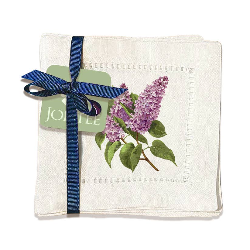 Ensemble de six serviettes à cocktail avec ourlet. Toutes les serviettes sont fabriquées à la main et le design est appliqué à la main. La taille et le design peuvent légèrement varier d'une serviette à l'autre. Les serviettes sont lavables en machine mais peuvent avoir besoin d'être repassées et amidonnées.