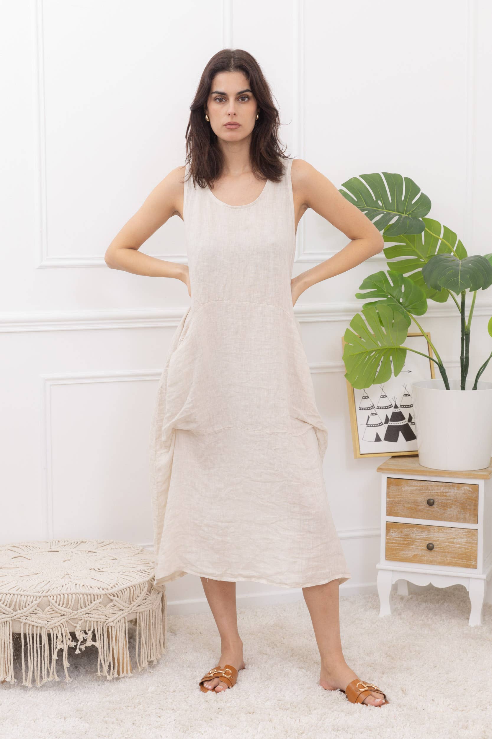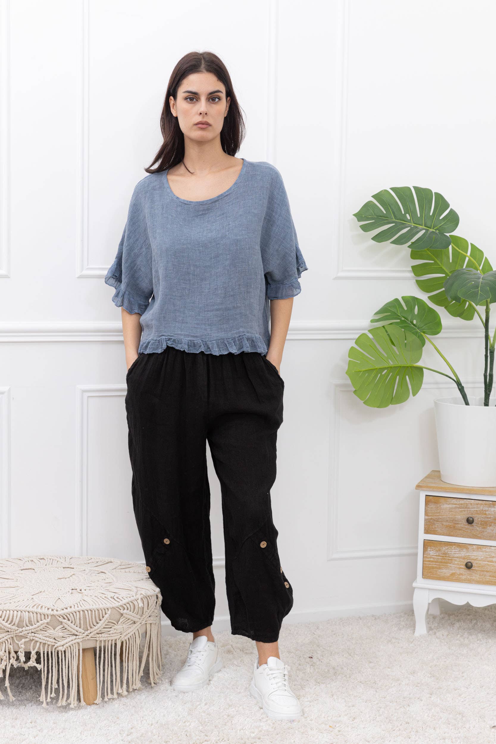 Top Oversize en Lin avec Nœud sur les Manches – Légèreté et Élégance Décontractée Ce top oversize en lin est l’essence même du confort et du style effortless. Conçu pour offrir une coupe ample et fluide, il vous enveloppe de douceur tout en laissant une liberté de mouvement totale. Le petit détail qui fait toute la différence ? Les nœuds élégants au niveau des manches, apportant une touche de féminité subtile à ce basique intemporel. Caractéristiques : Tissu : 100% lin, ultra léger et respirant, parfait pour la saison chaude. Coupe : Oversize pour un look décontracté et moderne, Manches : Manches 3/4 à nœuds Col : Col rond minimaliste, idéal pour être porté seul Disponible en taille unique pour s’adapter à toutes les silhouettes du 38-44 (M au XXL)