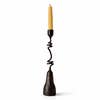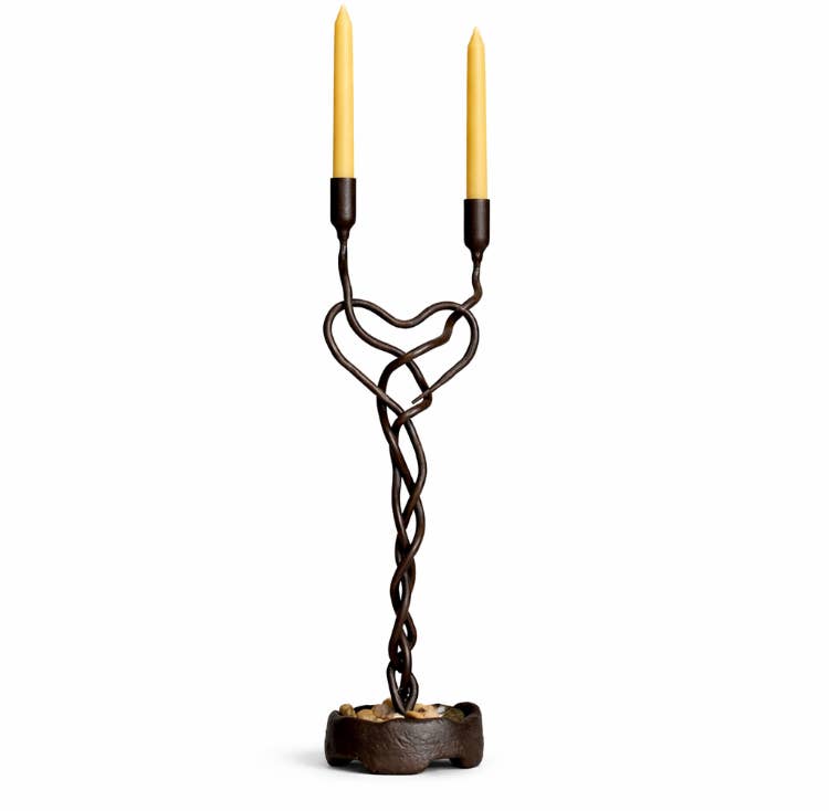Bougeoir en fer unique fait à la main Un bougeoir sculptural et contemporain fabriqué à la main en fer forgé. Ses lignes fluides et entrelacées évoquent deux âmes s'élevant du sol dans une danse gracieuse, fusionnant en une seule à travers la lumière. Ludique mais romantique, cette pièce semble à la fois symbolique et intemporelle—un accent expressif pour des intérieurs raffinés. La forme en fer émerge de manière organique d'une base solide en coupe, qui contient des galets naturels de couleur chair ajoutant chaleur et texture ancrée. La silhouette reste légère et aérée, ce qui la rend idéale pour les consoles, étagères et espaces architecturaux intimes. Détails • Dimensions : 3” de diamètre x 20,5” de hauteur • Matériau : Fer forgé à la main / fer forgé • Finition : Patine naturelle en fer sombre • Base : Coupe intégrée avec galets décoratifs de la taille d'un pois • Style : Contemporain / sculptural Options de bougie • Version standard : • Contient une bougie en cire d'abeille de ½” x 6” (incluse) • Bougies supplémentaires disponibles à 1,40 $ chacune • Version grande coupe : • Contient une bougie en cire d'abeille de ⅞” x 6” • Bougie incluse • Bougies supplémentaires disponibles à 3,50 $ chacune • Prix : 90,00 $ chacune Chaque pièce est fabriquée individuellement à la main, entraînant de subtiles variations qui célèbrent le processus artisanal et rendent chaque bougeoir véritablement unique.