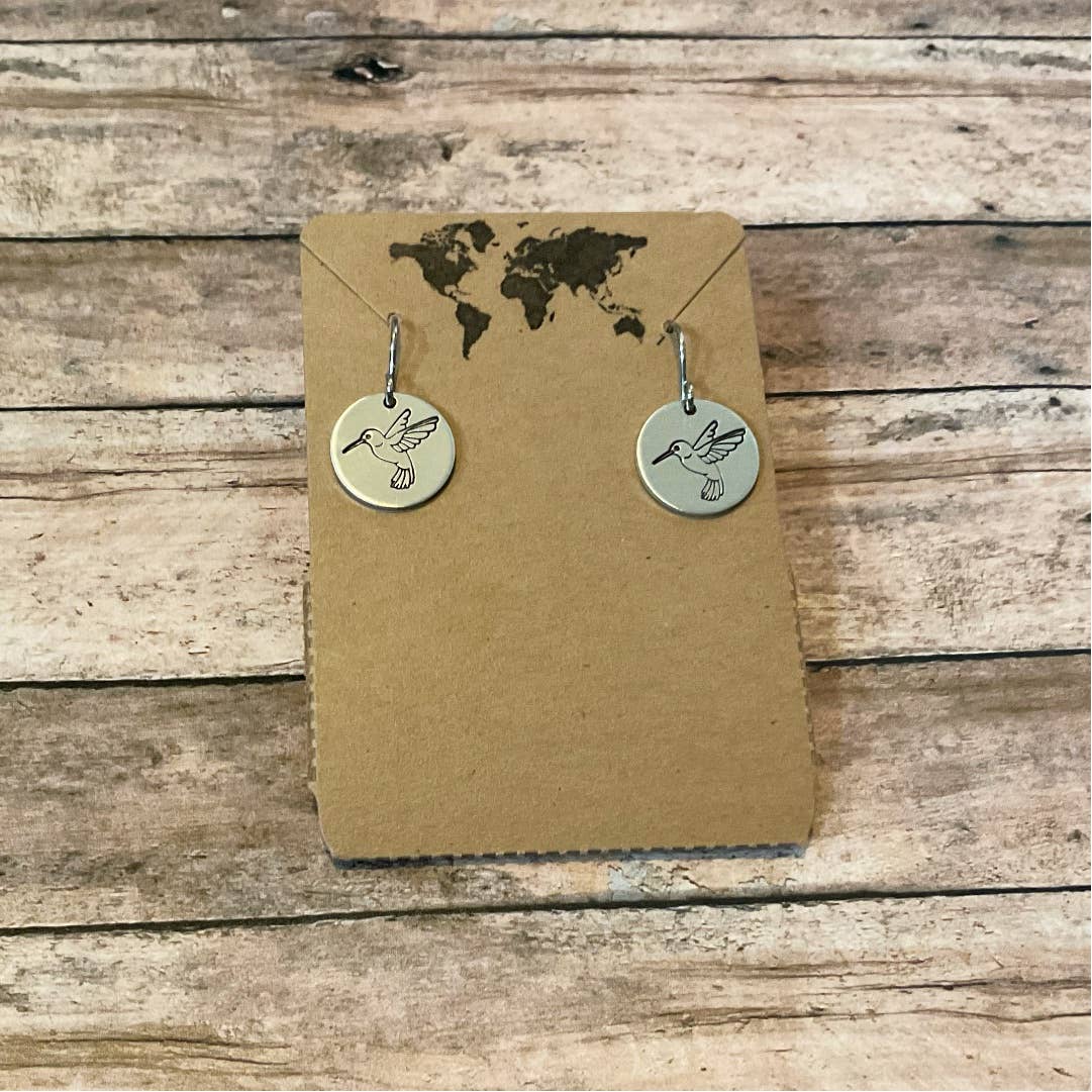 Petits disques en métal alkeme de 1/2 » de couleur argent. Fabriqué avec des fils d'oreille en acier inoxydable hypoallergénique. Tous les bijoux sont estampés à la main individuellement et de légères variations peuvent survenir.