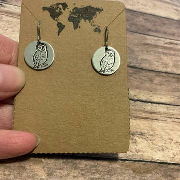 Petites boucles d'oreilles circulaires argentées en forme de chouette des clochers, harfang des neiges en vente B2B