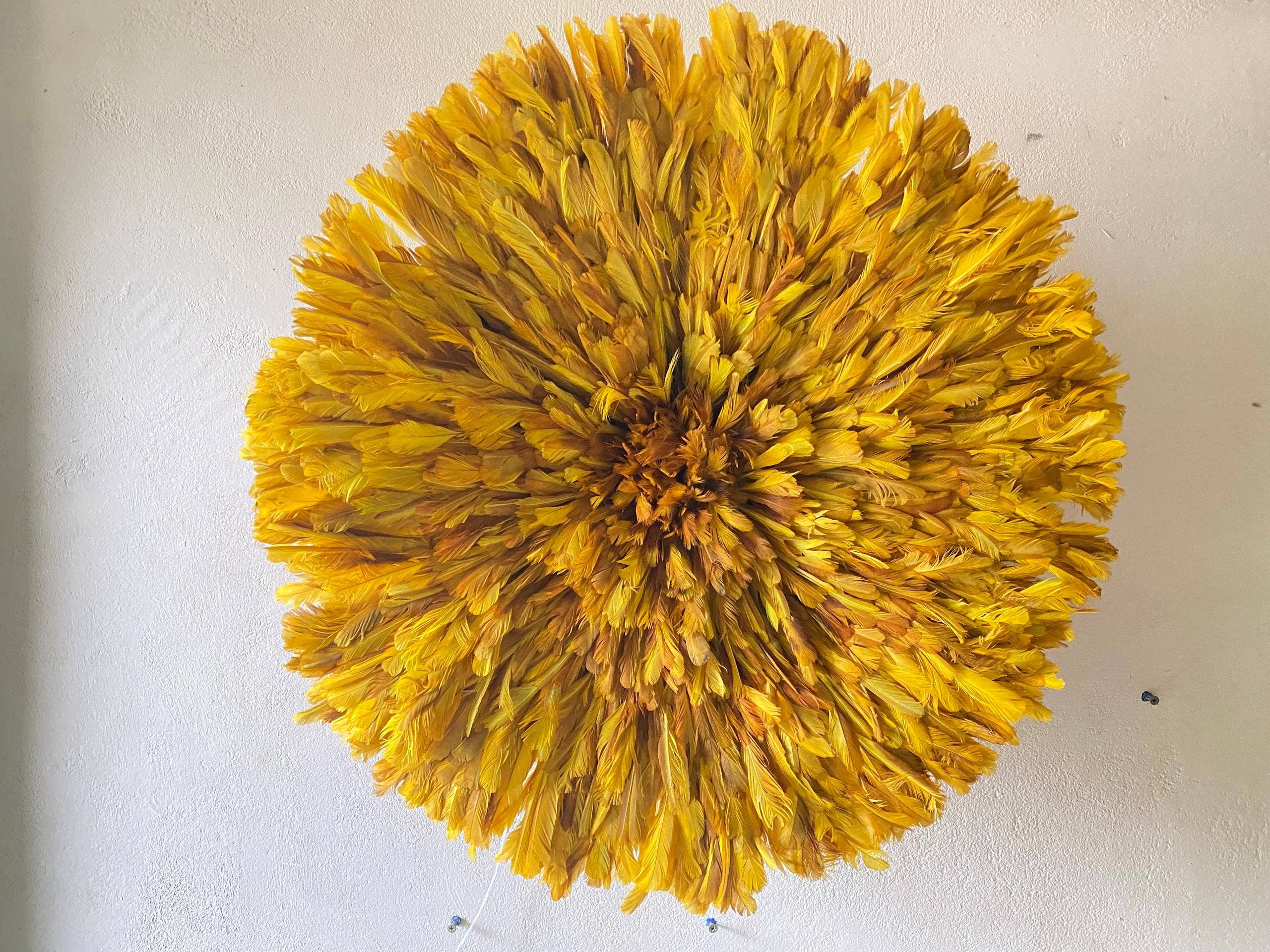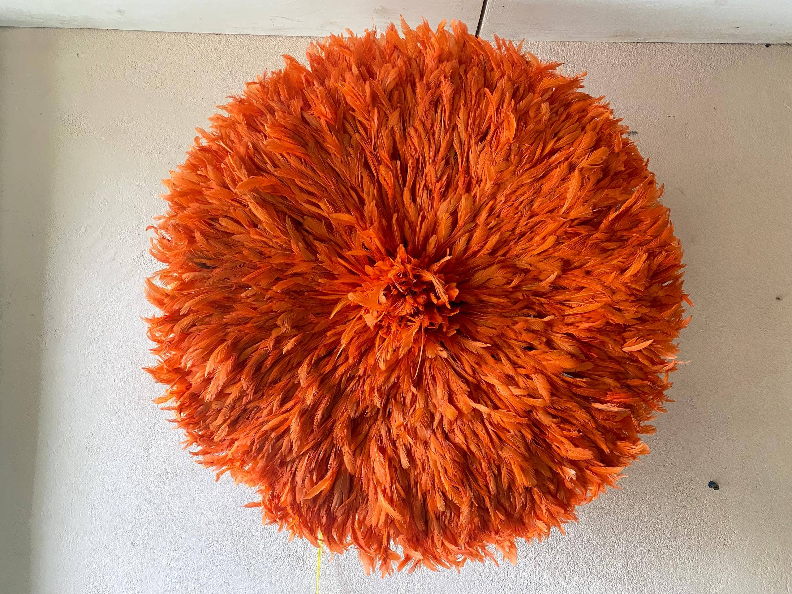 Ensemble de 5 chapeaux juju pour décorer vos murs intérieurs, avec des dimensions de 60 cm (24 pouces), 50 cm (16 pouces), 40 cm et 2x30 cm (12 pouces). Fabriqués à partir de plumes naturelles blanches ou ivoire ainsi que de plumes beige ou tan, soigneusement cousues à une base en raphia. Chaque pièce est entièrement faite à la main au Cameroun, en Afrique. Ce travail artisanal utilise un savoir-faire remarquable combinant des bases de plumes naturelles, des bâtons de raphia et des tissus. Cet artisanat est un héritage ancestral transmis de génération en génération. Les chapeaux juju sont réputés pour incarner les qualités des oiseaux et symboliser la prospérité. Ils ont dépassé les frontières du Cameroun pour orner les murs d’hôtels de luxe, écoles, maisons, et bien d’autres lieux. Les décorateurs d’intérieur adoptent ces chapeaux dans leurs projets pour valoriser leur originalité et leur beauté unique. Pour toute question, contactez-nous directement via notre page contact sur le site web ou par Whatsapp au numéro indiqué ci-dessous.