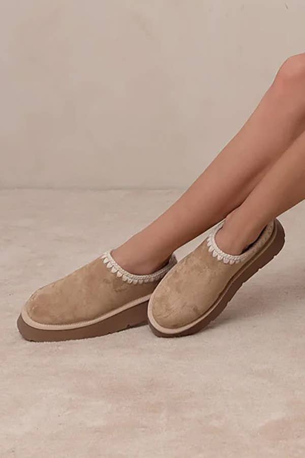 L'essentiel confortable avec une touche de plateforme. Le modèle BRANDI incarne ce look douillet doublé de shearling avec une texture douce semblable au daim, une bordure en point de feston et une semelle plateforme ultra-légère - votre choix idéal pour les jours de repos et les moments de détente à l'intérieur comme à l'extérieur. -Matériaux : Matériau supérieur : Textile supérieur Matériau de la semelle intérieure : Coussin DreamCloud Matériau de la semelle ou du talon : Semelle en caoutchouc -Détails : Marque : Oasis Society Hauteur du talon : 3,8 cm Plateforme avant : 3,2 cm Hauteur de la tige : 3,8 cm Types de fermetures : À enfiler