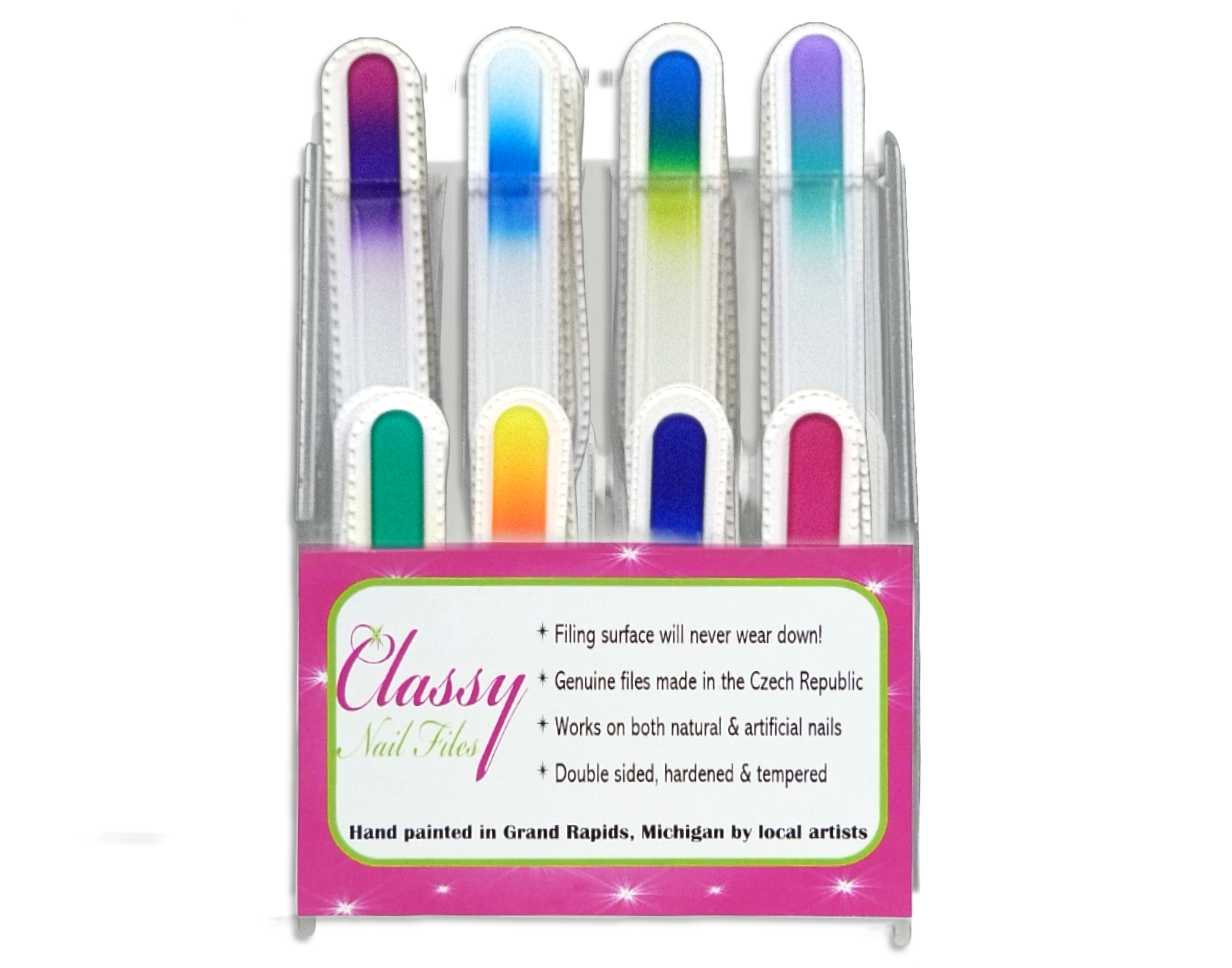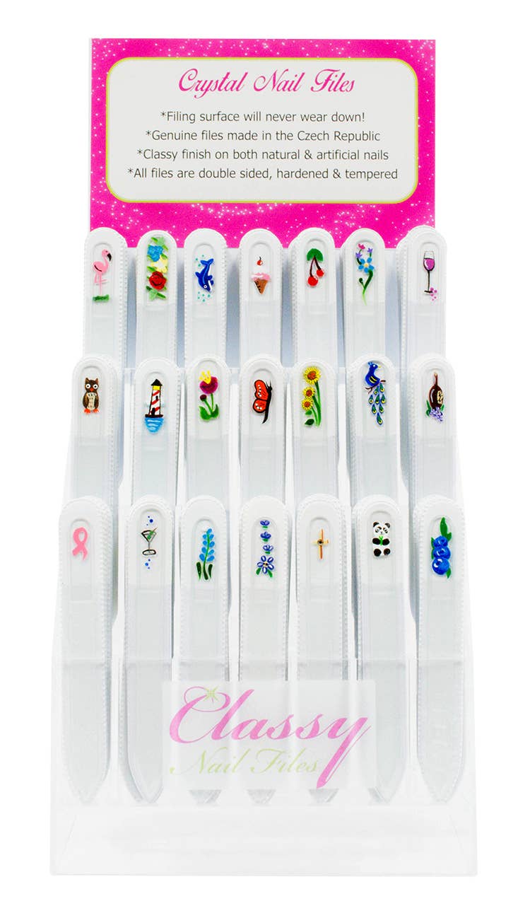 Petit écran avec 48 fichiers couleur de taille moyenne -comprend un présentoir de comptoir GRATUIT Les limes à ongles Classy sont en cristal véritable fabriquées en République tchèque et peintes individuellement à la main par nos artistes à Grand Rapids, dans le Michigan (États-Unis). La surface est gravée des deux côtés et garantit qu'elle ne s'émousse jamais et ne s'use jamais. Ils sont parfaits pour les ongles naturels et artificiels... et suffisamment doux pour être utilisés sur les bébés ! Contrairement aux cartes mémoires, les limes à ongles Classy peuvent être utilisées dans les deux sens et ne vous déchireront pas les ongles. Vos ongles seront lisses comme au salon ! Les limes à ongles Classy améliorent même la santé de vos ongles en y incorporant du kérotin ! Avec plus de 200 modèles, nous en avons pour tous les goûts ! Les limes à ongles Classy sont d'excellents cadeaux pour les enseignants, et elles sont idéales pour tous les besoins en matière de cadeaux !