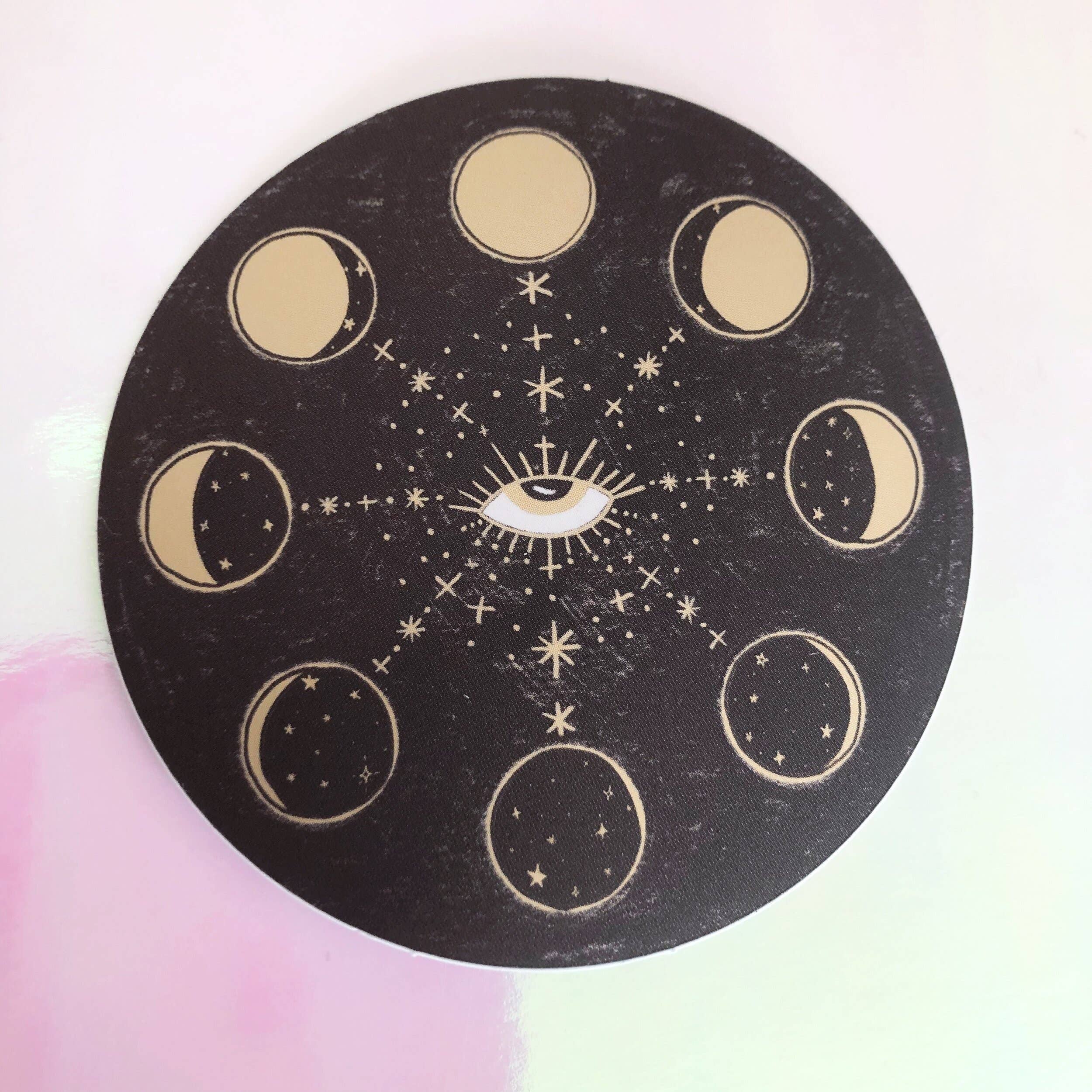 Autocollant en vinyle mat métallique de 2,9 x 2,9 pouces de mon illustration originale de phases de lune mystiques avec des accents dorés