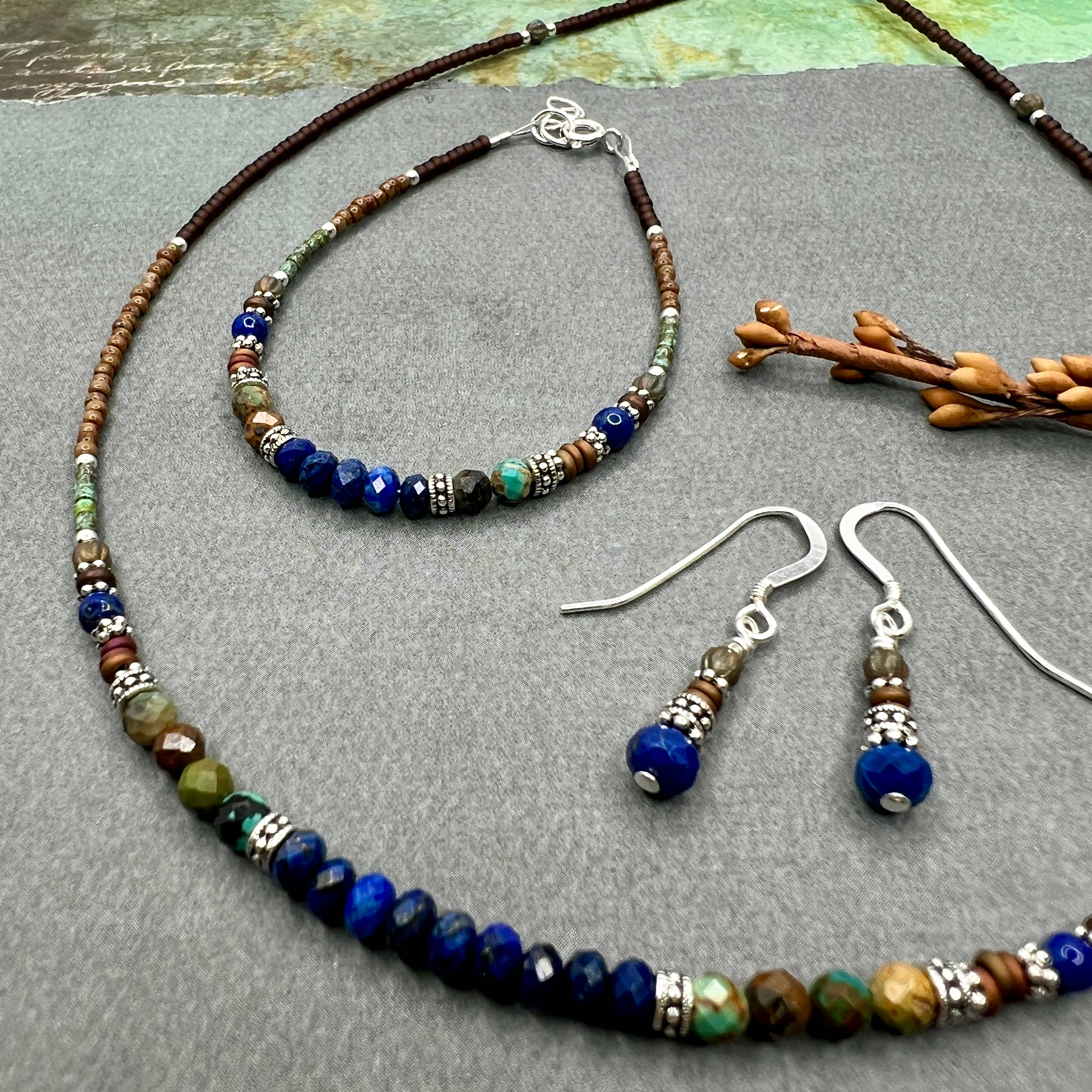 Une perle ovale en étain ornée d'un motif de feuille orne le centre de cet ensemble, avec des cristaux bleu ardoise et des perles en cristal gris platine, toutes deux de la plus haute qualité, avec des coquillages en ivoire, des perles d'eau douce, des détails en étain et en argent sterling, sur un fil de perles de rocaille ivoire beige brillant. Fermoir en argent sterling. Le bracelet est livré avec une chaîne de réglage en argent sterling de 7 à 7 pouces, les colliers mesurent tous deux 18 pouces de long, notre taille la plus vendue. Les crochets des boucles d'oreilles sont tous en argent sterling. Ce style est basé sur des demandes pour une version plus petite et plus élégante de notre Ivory Tree of Life. Cette version s'avère très populaire. Ce style est limité. Toutes nos pièces sont étiquetées et étiquetées, avec la liste des matériaux utilisés, car il est important de savoir ce que vous achetez:)