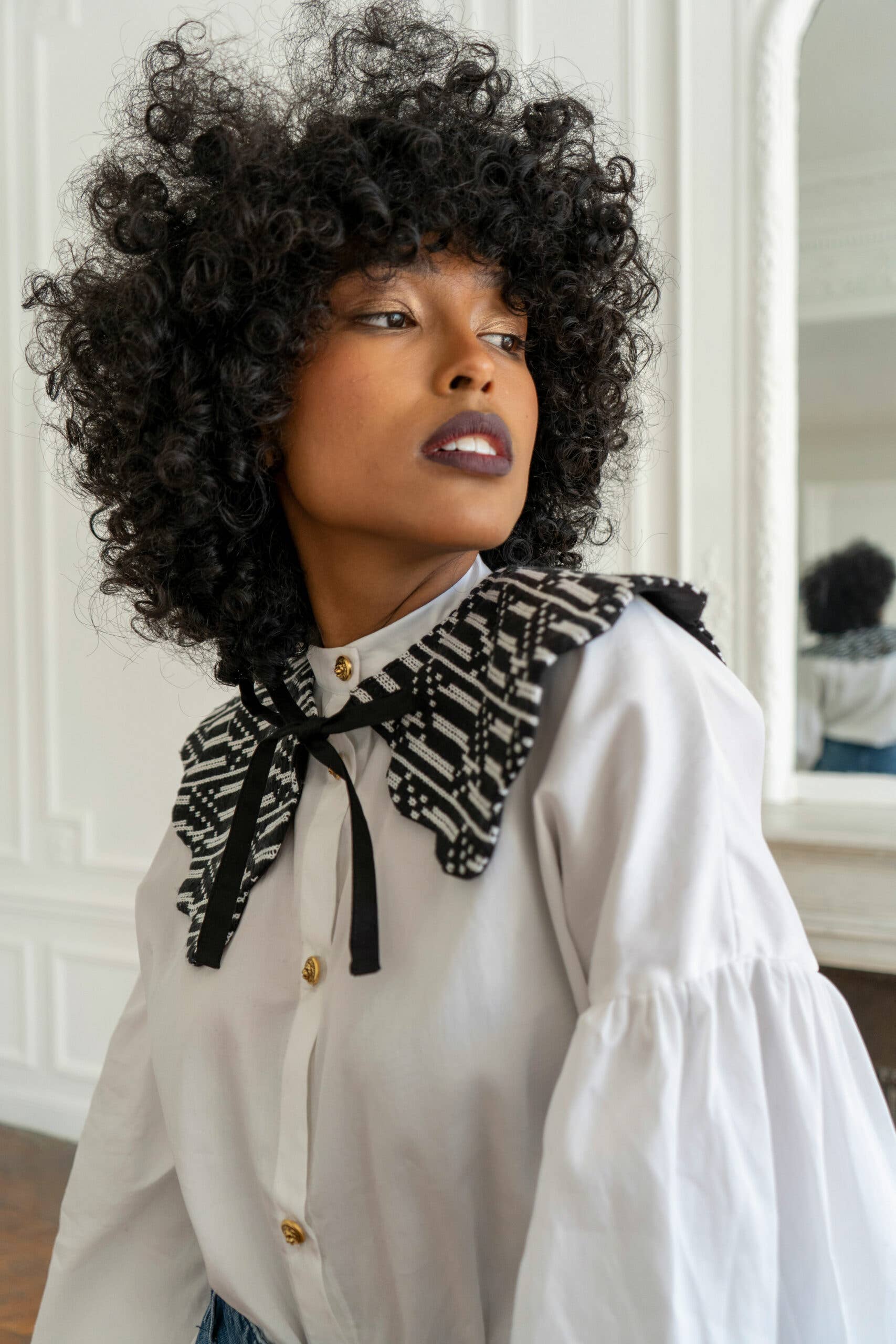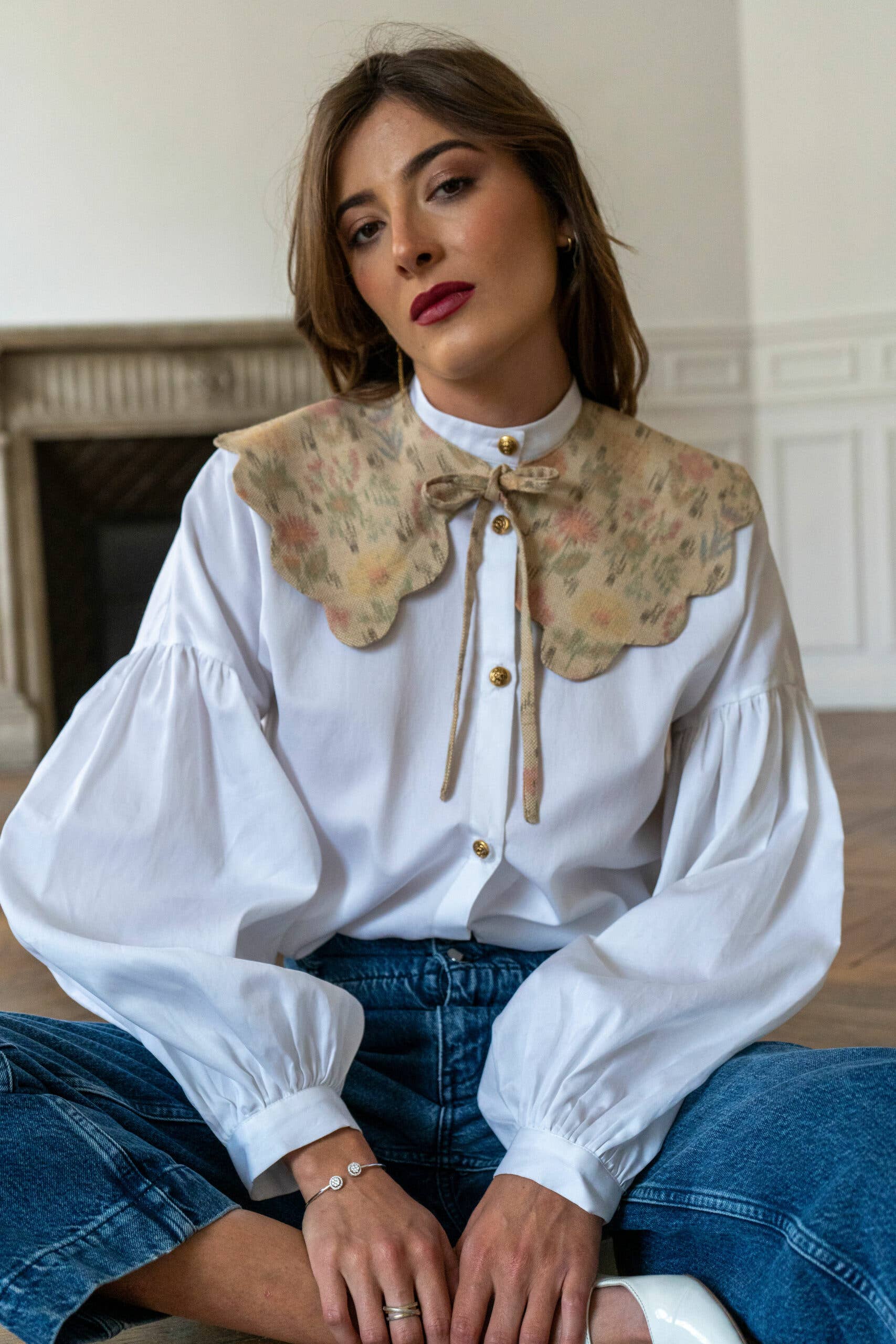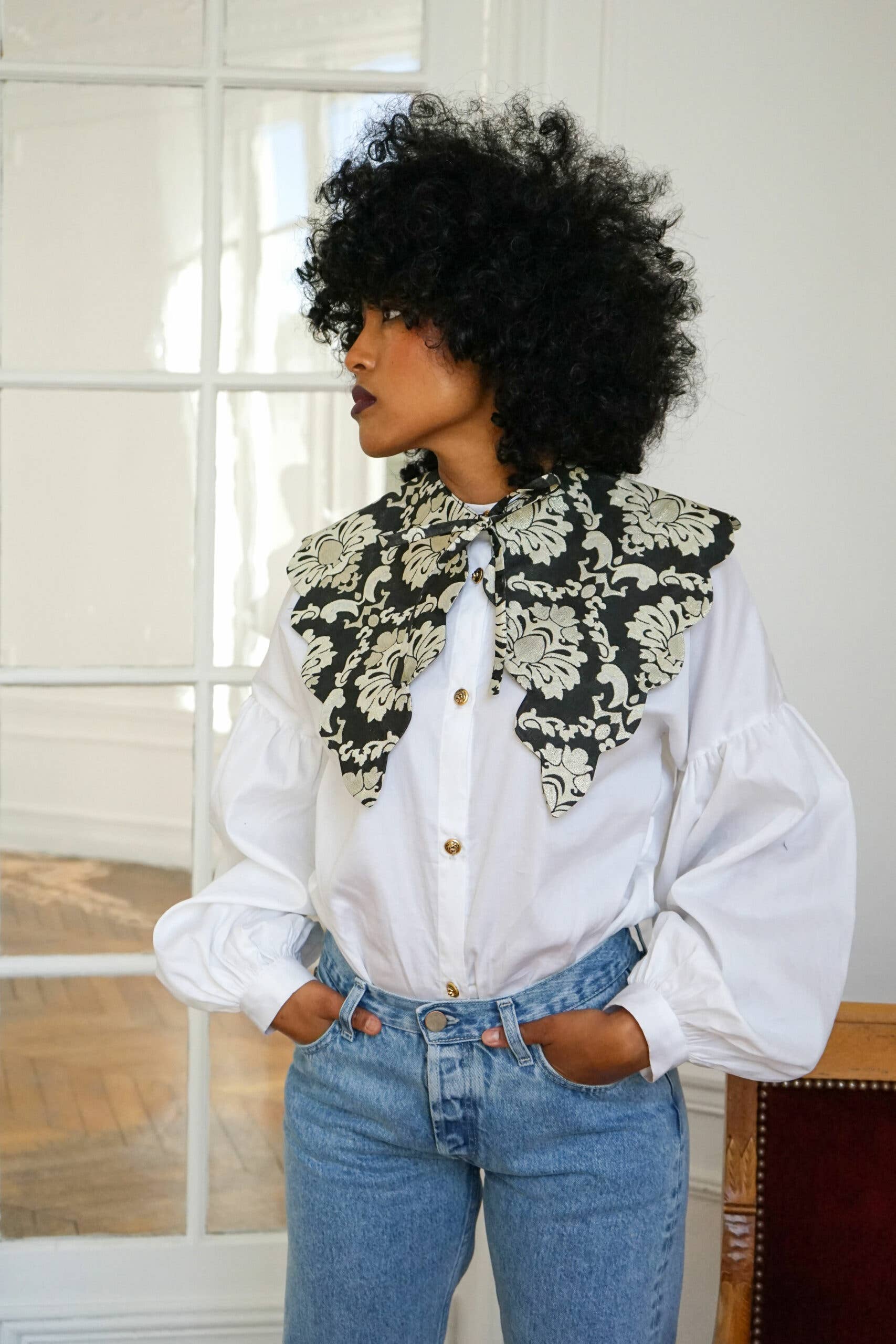 DESCRIPTION DU COL Colette est un col claudine oversized à festons. Ce modèle a été fabriqué dans denim texturé. Le jeu de matière entre le denim brut et le coton effiloché lui crée un motif à rayures colorées aux petites coutures rouges. COMMENT LE PORTER Porté sur une robe Nina denim clair, le col Colette Fancy Denim fait des merveilles. On l’adopte pour toutes les occasions, pour des looks très casual avec un top blanc ou un peu plus sophistiqués en mix and match sur un autre imprimé. INSPIRATION Le col Colette Fancy Denim est inspiré par mon amour inconditionnel pour le denim. Tous les cols Rosamen Bado ont été imaginés comme des ornements vestimentaires, des couronnes triomphantes totalement réinventées à porter autour de son cou. C’est le petit truc en plus qui réhausse un look en un claquement de doigt UNE PRODUCTION LOCALE Toutes les pièces Rosamen Bado sont fabriquées à Paris. Taille unique