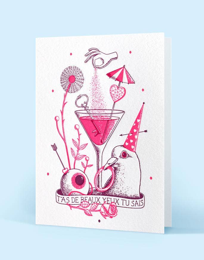 Carte double 11x15 cm Papier blanc naturel 350g certifié FSC Impression letterpress rose fluo et vert Enveloppe jaune vif auto-adhésive.Illustration Amandine Meyer, imprimé à Paris