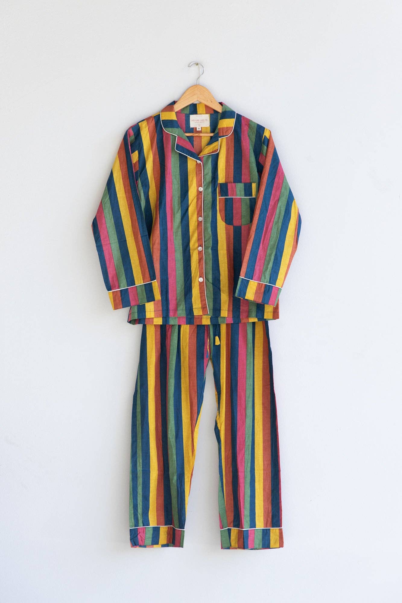 Ensemble pyjama en coton biologique Favourite Travels – Une évasion vibrante et confortable Cet ensemble pyjama Favourite Travels habille vos nuits et matins d'un imprimé coloré et intégral, mêlant élégance classique et touche contemporaine. Conçu pour une coupe décontractée mais structurée, il se distingue par des finitions contrastées en bourdon pour un style raffiné. Le pantalon est doté de poches latérales pratiques et d'une ceinture élastiquée ajustable avec cordon de serrage en tissu. Fabriqué à 100 % en coton biologique certifié GOTS, cet ensemble offre une douceur et une respirabilité idéales pour un sommeil paisible. La chemise présente un col cranté, des boutons, de longues manches avec poignets et une poche plaquée sur la poitrine. Le pantalon assorti comprend une ceinture élastiquée à cordon en tissu, des poches latérales et une poche arrière pratique. La longueur intérieure de la jambe est de 76 cm, assurant un ajustement parfait. Pourquoi vous allez l’aimer : - 100 % coton biologique certifié GOTS pour un confort et une respirabilité supérieurs - Imprimé intégral éclatant qui apporte une touche fraîche à vos vêtements d’intérieur - Coupe décontractée mais structurée avec finitions contrastées pour une allure élégante - Design pratique avec ceinture cordon, poches latérales et poche arrière Conseil taille : Le mannequin mesure 1,75 m, porte un UK taille 6 (S). Pour une coupe plus ample, prenez une taille au-dessus. Entretien : Lavage en machine à froid, ne pas mettre au sèche-linge. Repassage à fer doux. À noter : L’emballage cadeau n’est pas remboursable en cas de retour.
