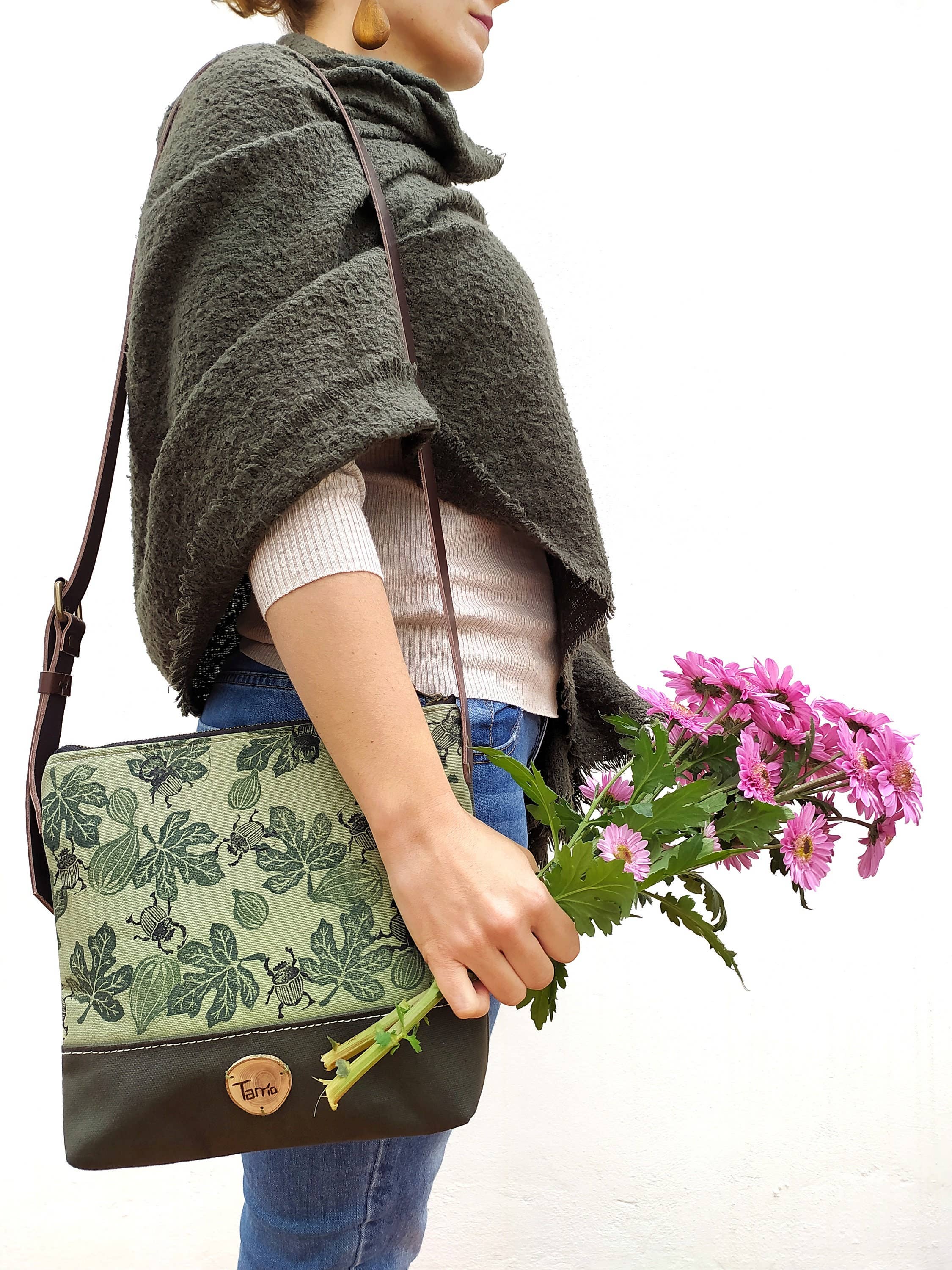 Pièce appartenant à la collection "Il y avait un jardin" (2017) de Made in Tarrío. Cette jolie banane est fabriquée en tissus épais d'ameublement de couleur gris clair et moutarde. Il s'agit d'un sac ceinture, imprimé et confectionné à la main dans notre atelier. Le tissu d'ameublement à l'avant est particulièrement remarquable pour son toucher doux, sa structure et sa qualité. Nous y imprimons un motif de caméléon en vert. Le processus d'impression est réalisé à l'aide de tampons ou de blocs sculptés à la main également par nous, et chaque caméléon est toujours différent en raison du processus d'impression lui-même. Sa partie arrière, cependant, est du même type de tissu mais en vert et n'est pas imprimée. La banane comporte une fermeture à glissière en métal et est doublée à l'intérieur de coton vert uni. La sangle est en cuir de vachette de première qualité de couleur marron chocolat, et acquiert une belle brillance en vieillissant avec l'usage. Elle s'ajuste à la hanche à l'aide d'une boucle.