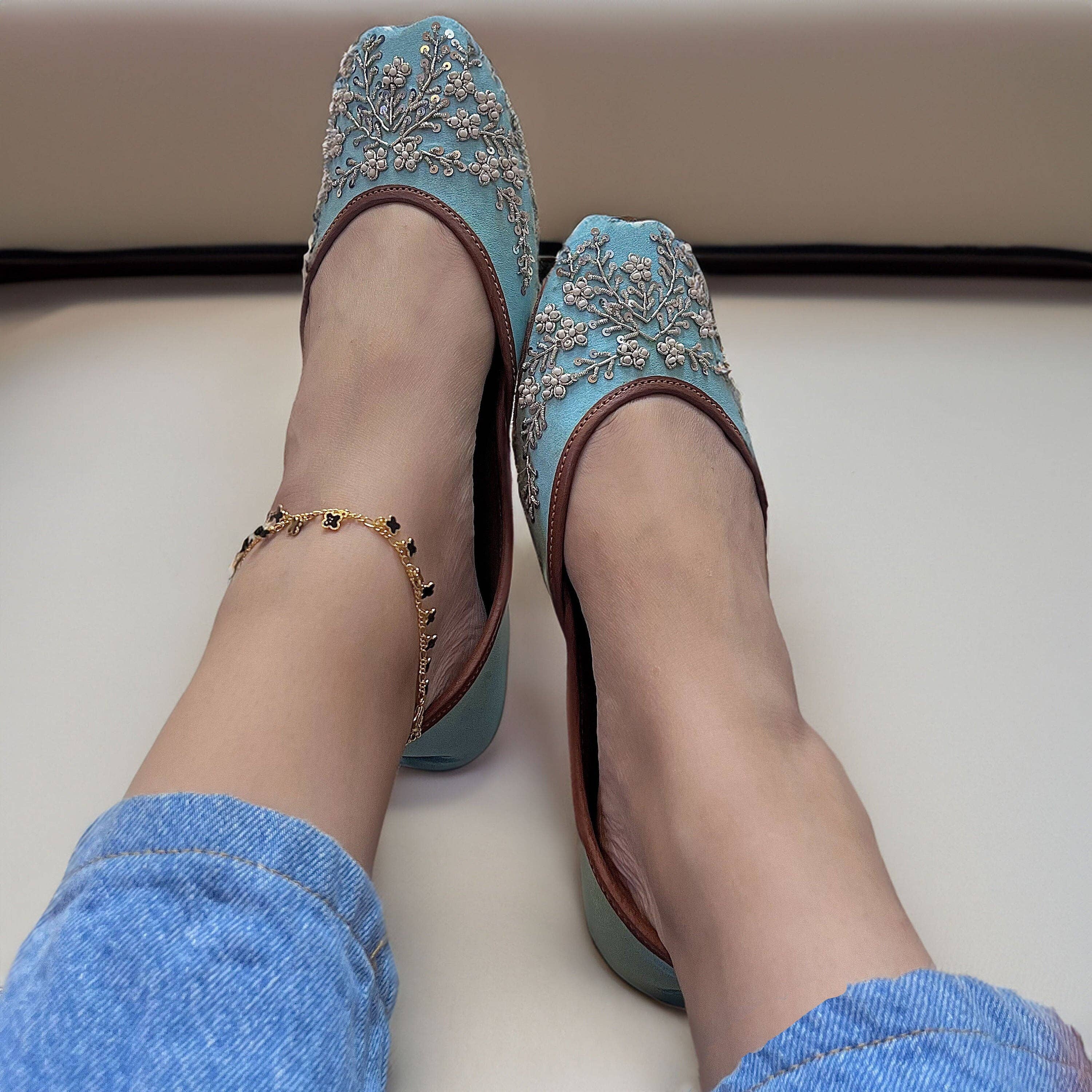 Découvrez à la fois l'élégance et le confort avec nos chaussures de mariage plates en ballet embellies Pearl Ensemble Bleu Ciel, méticuleusement conçues, avec des détails exquis en perles d'imitation. Ces chaussures magnifiques sont conçues pour ajouter une touche de sophistication à votre tenue tout en gardant vos pieds confortables tout au long de la journée. Caractéristiques principales * Base Bleu Ciel : Une couleur sereine et polyvalente qui complète à la fois les tenues décontractées et formelles. * Ornements en Perles d'Imitation : Perles disposées avec soin pour une finition gracieuse et luxueuse, idéales pour les mariages et les occasions spéciales. * Semelle Intérieure Rembourrée : Offre un confort exceptionnel, les rendant parfaites pour une utilisation toute la journée. * Semelle Extérieure en Cuir Durable : Offre une durabilité longue durée tout en conservant une apparence élégante et stylée. * Excellence Artisanale : Chaque paire est fabriquée avec amour par des artisans qualifiés, garantissant un charme unique et une qualité supérieure. Parfaites pour chaque occasion Ces ballerines bleu ciel avec perles sont idéales pour : * Mariages : Complétez votre look de mariée ou de demoiselle d'honneur avec élégance. * Événements Festifs : Élevez votre style lors de célébrations culturelles ou de fêtes de fin d'année. * Élégance Quotidienne : Ajoutez une touche raffinée à vos tenues décontractées ou de bureau. Options de personnalisation Rendez vos ballerines vraiment uniques avec ces choix de personnalisation : * Broderie au Dos : Ajoutez des initiales significatives, des dates spéciales ou des motifs uniques. * Pendants Ghungroo/Clochettes : Créez une ambiance ethnique avec des clochettes tintinnabulantes. * Designs Personnalisés : Partagez vos idées, et nous les réaliserons pour vous ! Pieds larges ? Nous avons ce qu'il vous faut ! Nos ballerines sont disponibles en tailles larges et plus larges pour garantir un ajustement confortable pour tout le monde. Veuillez nous contacter pour des conseils sur les tailles avant de passer votre commande. Guide des tailles Pour garantir un ajustement parfait, consultez le tableau des tailles dans les images du produit. Si vous avez des doutes, n'hésitez pas à nous contacter—nous serons ravis de vous aider à trouver la bonne taille pour vous. Pourquoi choisir ces ballerines bleu ciel ? * Design Sophistiqué : Un mélange époustouflant de bleu ciel et de perles pour un look chic sans effort. * Confort Inégalé : Les semelles intérieures rembourrées offrent un soutien maximal pour une utilisation prolongée. * Artisanat de Haute Qualité : Fabriqué à la main avec soin en utilisant des matériaux de qualité supérieure pour la durabilité et le style. * Attrait Polyvalent : Idéal pour les mariages, les fêtes et l'élégance quotidienne.