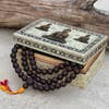 Un mala véritablement intentionnel : perles de graines de Bodhi de 46" avec trois accents en coquille de conque gravés d'Om, un cordon réglable rouge et or, et une boîte en bois pour le rangement—conçu pour une pratique significative. Excellente qualité !!