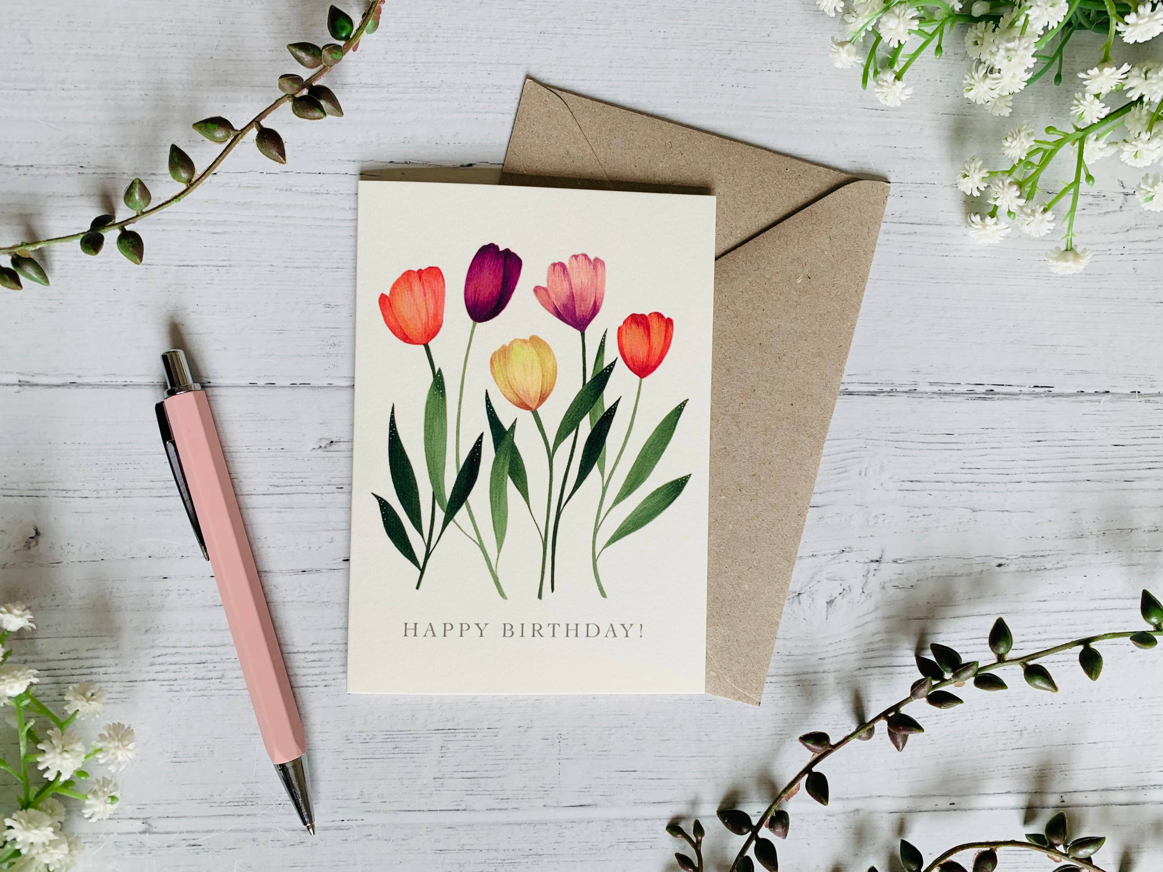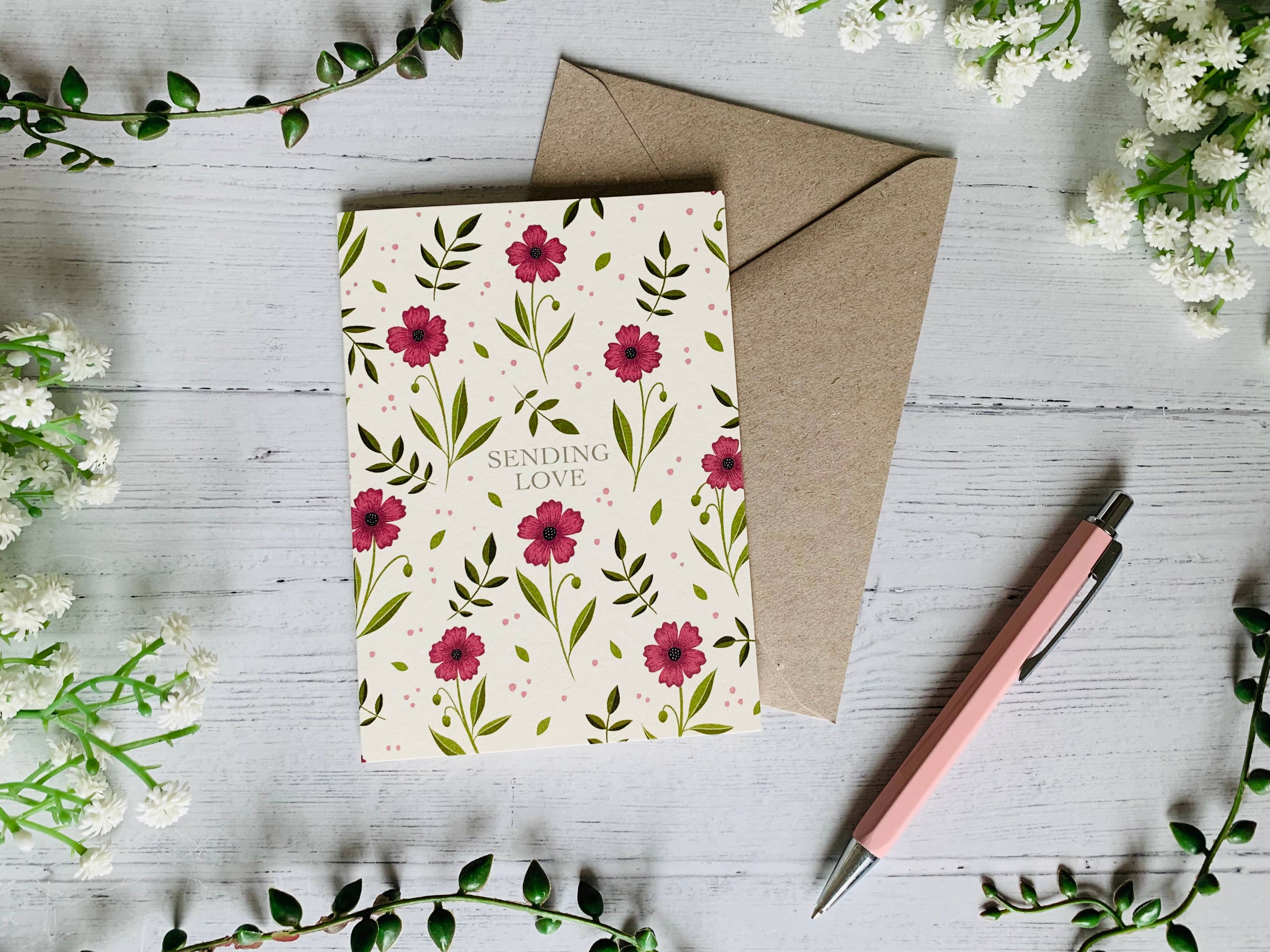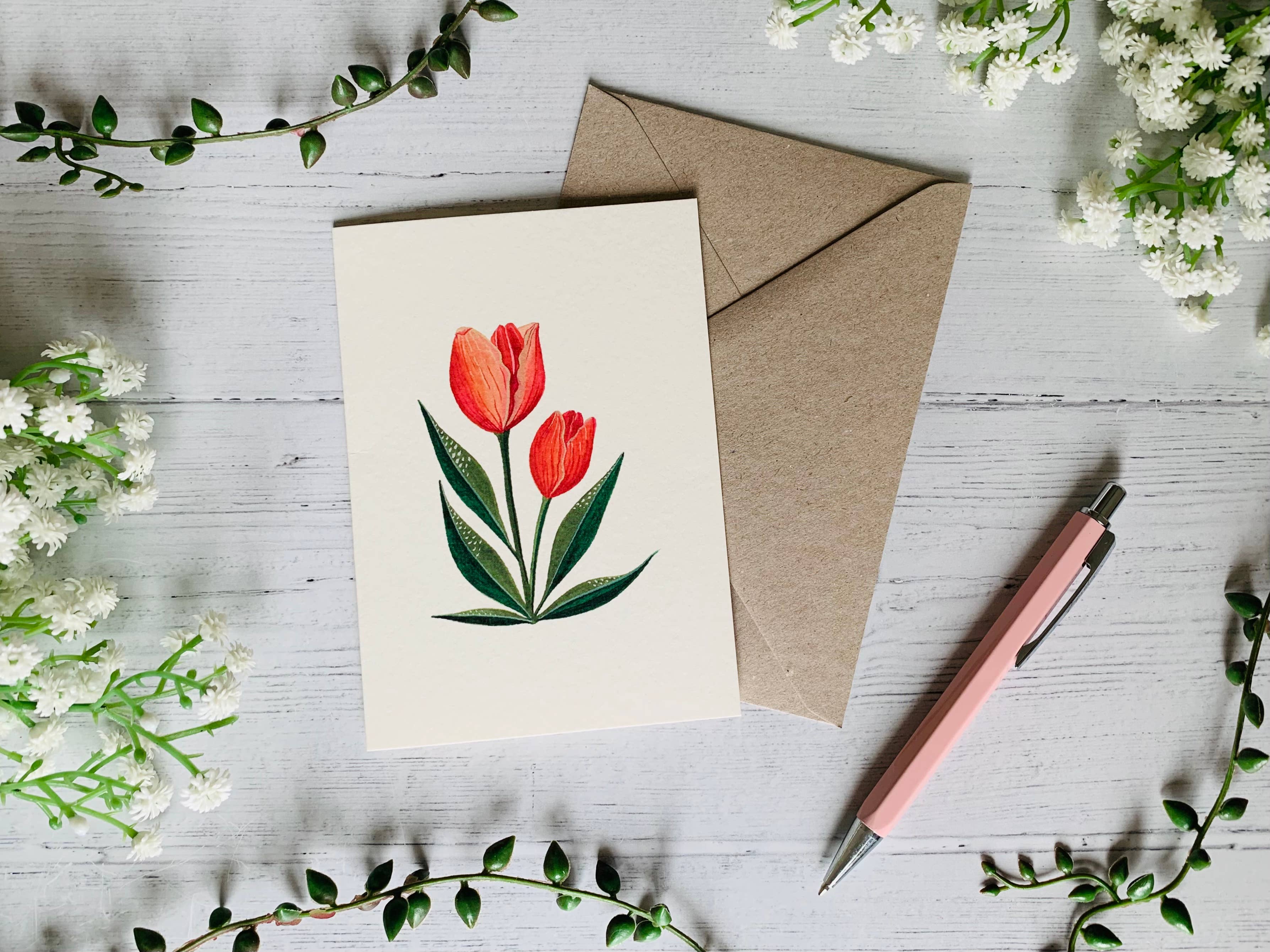 Carte de vœux de luxe A6, imprimée au Royaume-Uni sur du papier texturé Aquerello. Chaque carte est emballée avec une enveloppe en papier kraft et une pochette compostable en cellophane. Intérieur vierge.