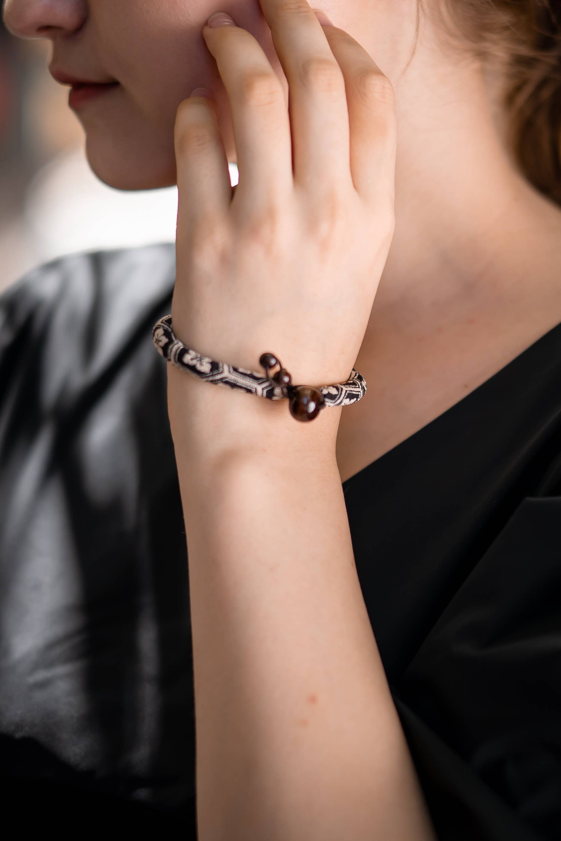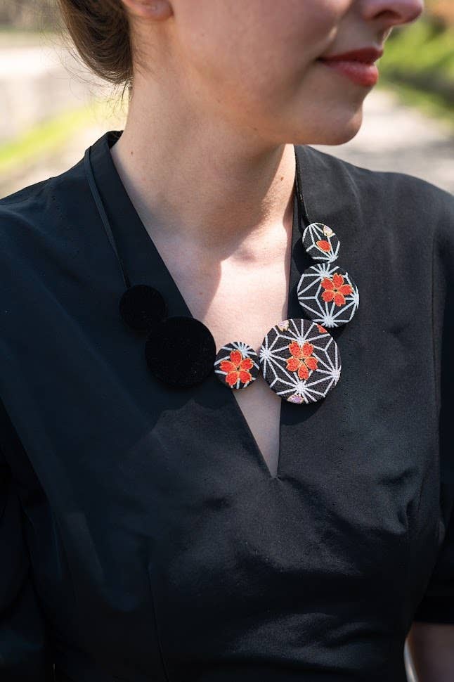 Bracelet en tissu kimono | Fleur noire Motif fabriqué à Kyoto