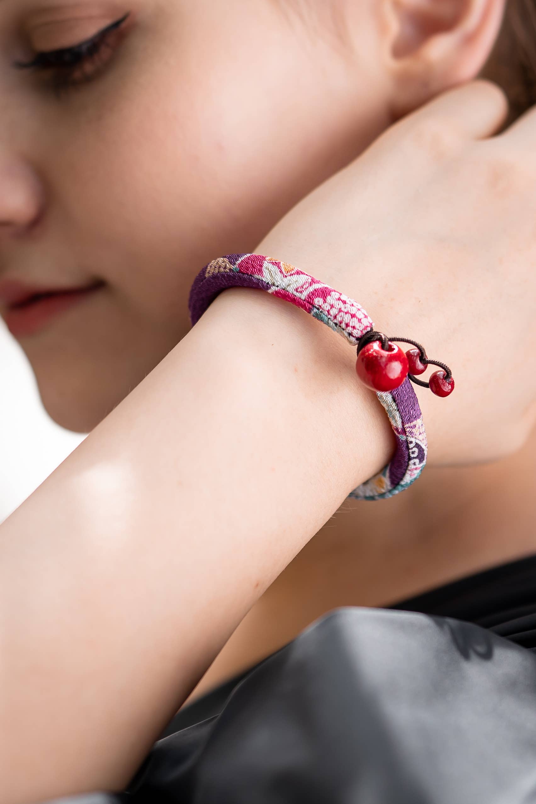 Ne sous-estimez jamais le pouvoir d'un petit bracelet. Fabriqués à partir de magnifiques tissus de kimono japonais, ces bracelets comportent trois sphères qui représentent la famille, l'amitié et l'amour. Certains croient qu'une fois attachés à votre poignet, ils peuvent également vous porter chance. Le chirimen est l'un des tissus les plus célèbres du Japon grâce à son utilisation dans des kimonos d'une beauté à couper le souffle et d'une élégance remarquable. Cependant, il est également résistant et pratique à bien des égards. Il est fabriqué en tissant du fil de soie ordinaire et se caractérise par de petites bosses à sa surface. Nous utilisons le Nikoshi Chirimen, fabriqué dans la péninsule de Tango, située dans la partie nord de la préfecture de Kyoto, et teint à Kyoto. Au Japon, la couleur rouge représente le bonheur, la force et la passion. Longueur : 18 cm Ajustement : Perles Poids : 8 g Matériaux : Chirimen, bois et polyester Précaution : Comme nous utilisons des teintures naturelles, les couleurs peuvent déteindre et laisser une trace sur les vêtements de couleur claire.