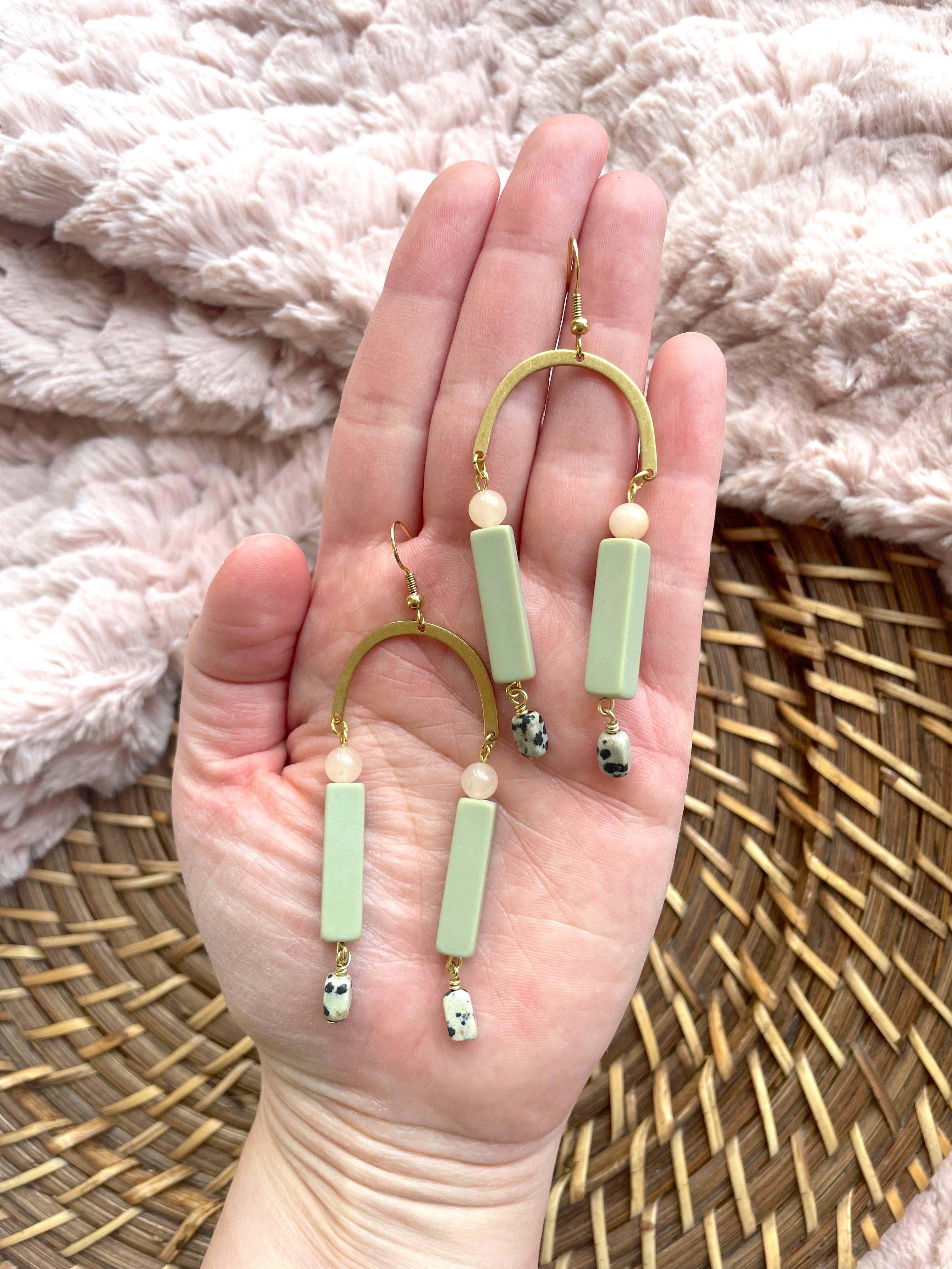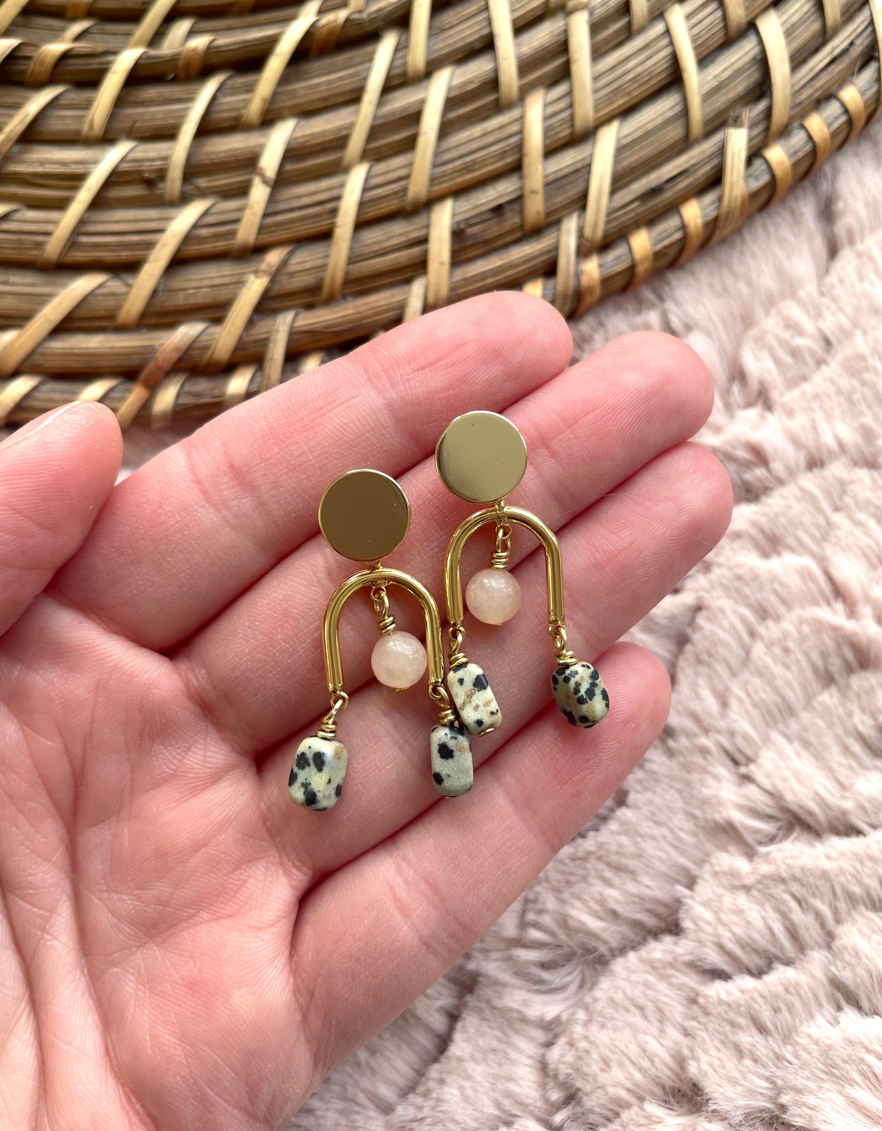 Cette collection présente une palette de couleurs douces de roses, de gris et de bruns. Il s'inspire des formes géométriques, de l'inadéquation et de l'asymétrie. Chaque pièce de cette collection comprend des perles de calcédoine pêche de 6 mm et des perles en lucite mat gris kaki vintage des années 1970. La calcédoine pêche est une pierre nourrissante qui absorbe les énergies négatives et favorise les bonnes vibrations. Il apporte de l'harmonie à l'esprit, au corps, aux émotions et à l'esprit. Ce style de mini clous arqués comprend des perles de calcédoine pêche de 6 mm et des perles de jaspe dalmatien rectangulaires de 7 mm. Ils pendent environ 1,40 pouce de long et mesurent environ 0,50 pouce en travers de leur point le plus large. Les clous sont plaqués or et doivent convenir aux oreilles sensibles. Ils sont très légers et faciles à porter au quotidien.