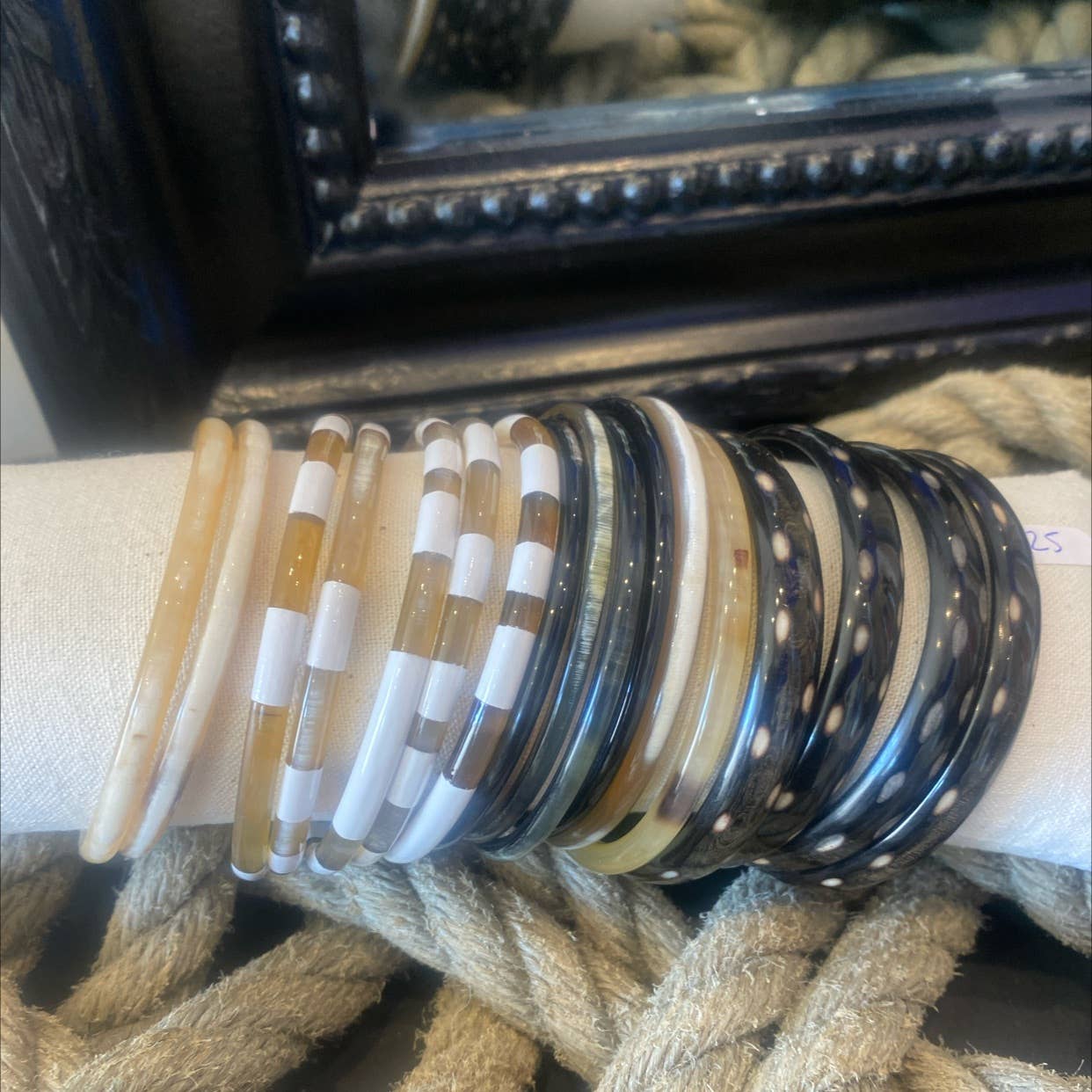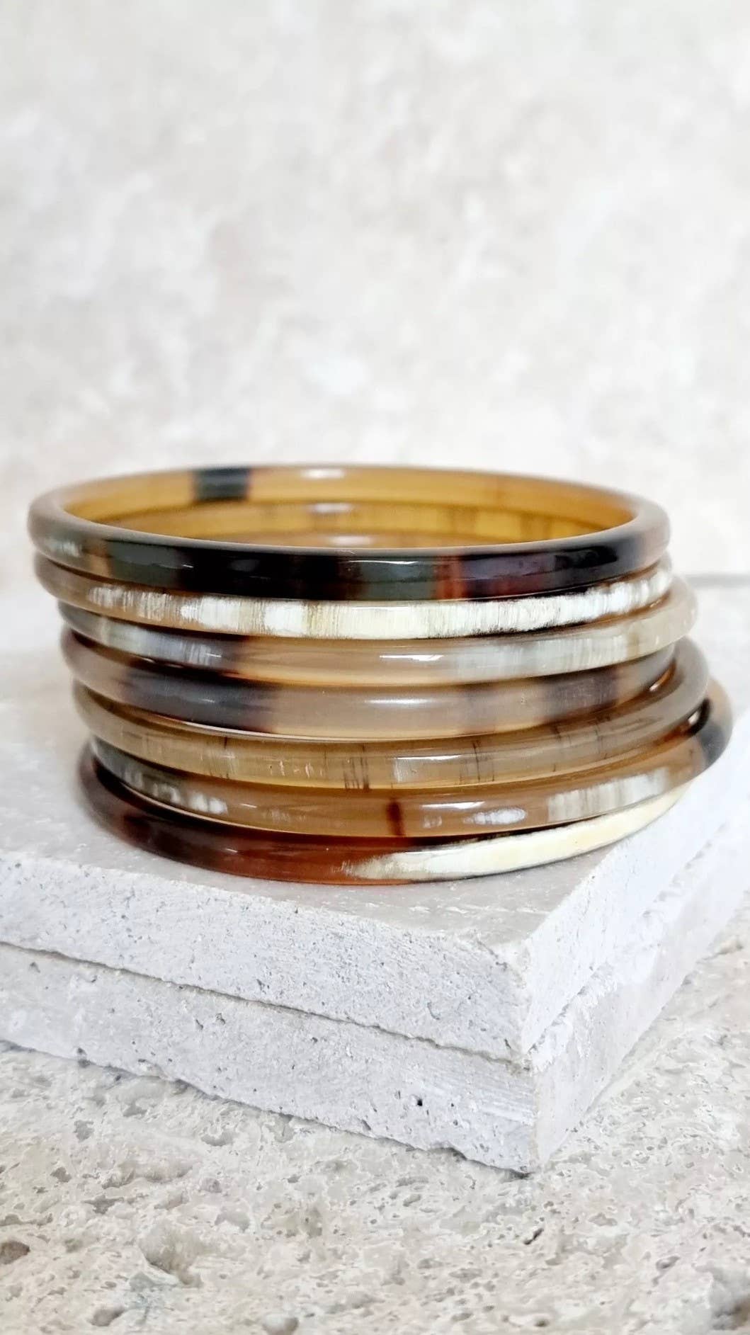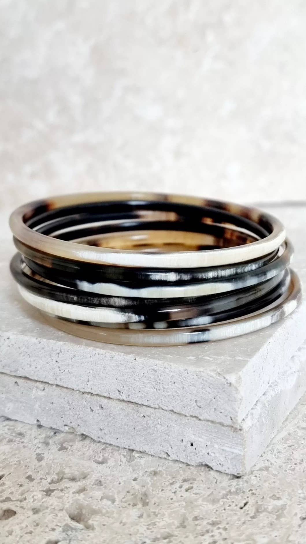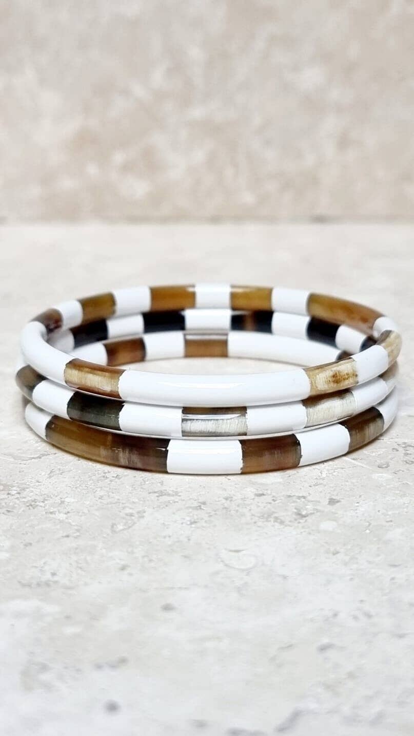 Les bracelets sont façonnés à la main par des artisans à partir de corne de buffle. Chaque bracelet est une pièce unique. Ce produit étant naturel, les teintes sont variables d'une pièce à l'autre. Taille environ 6.3 - 6.5 cm. Afin de protéger vos bijoux, évitez le contact avec l'eau / parfum.. Pour info : les cornes sont collectées de façon ecofriendly.