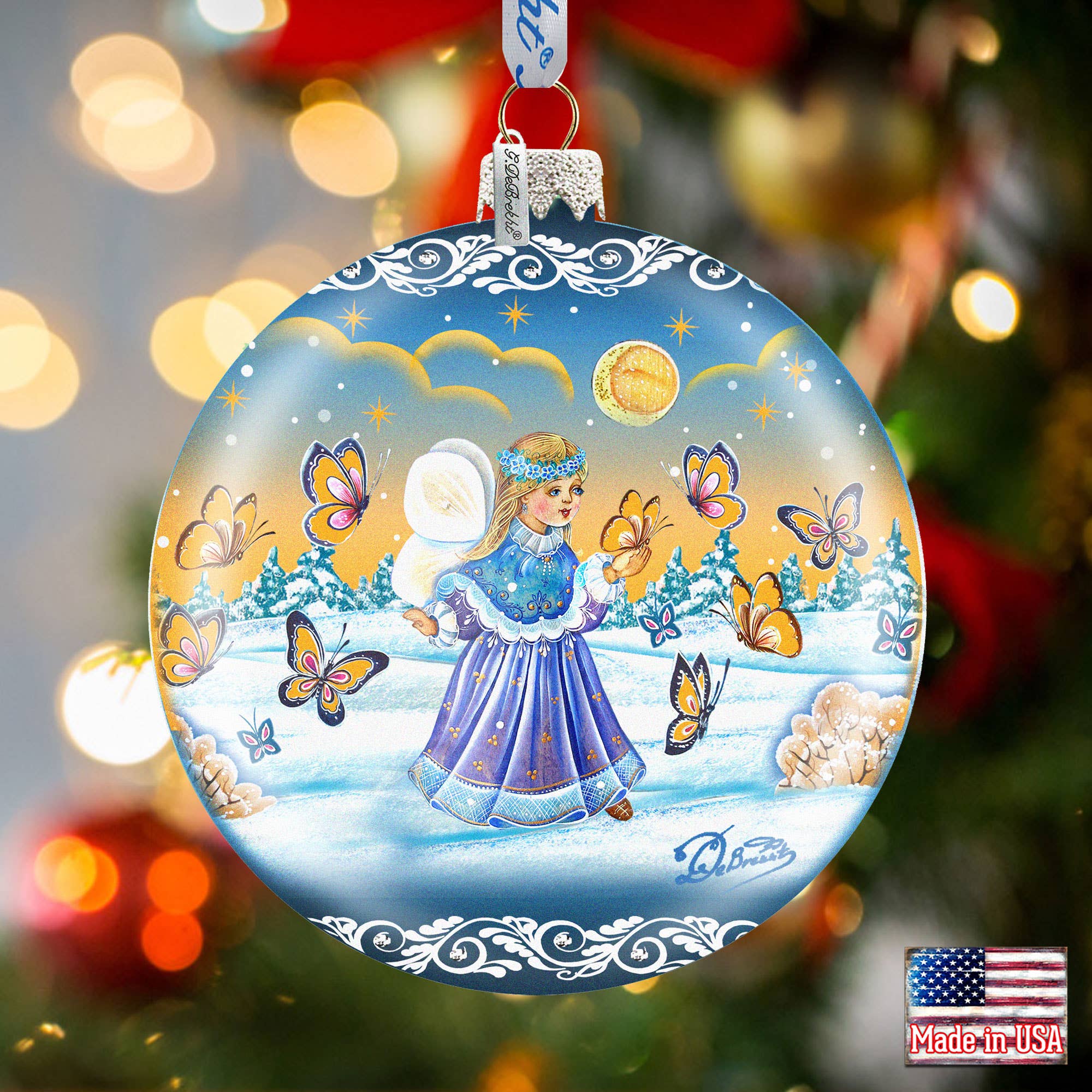 Collection d'ornements en verre Mercury Splendor de Holiday Splendor conçue par les artistes de renommée mondiale Andrew Debrekht, Dona Gelsinger, Susan Winget, Josephine Wall, Jamie Mills-Price, Jody Bergsma et d'autres. Les ornements sont peints artistiquement avec une touche d'or et d'argent pour un éclat subtil par les artistes talentueux G. DeBrekht aux États-Unis. Série classique Christmas, Winter Wonderland et Nativity peinte avec un effet lumineux irisé profond avec une touche d'or ou d'argent pour une brillance subtile, un joli ruban de satin et des bonnets perlés. La peinture décorative ou décorative continue autour de l'Ornement. Les ornements sont livrés dans une boîte luxueuse doublée de satin prête à être exposée au magasin lorsqu'il est ouvert et sécurisé pendant l'expédition. Fabriqué à la main aux États-Unis.