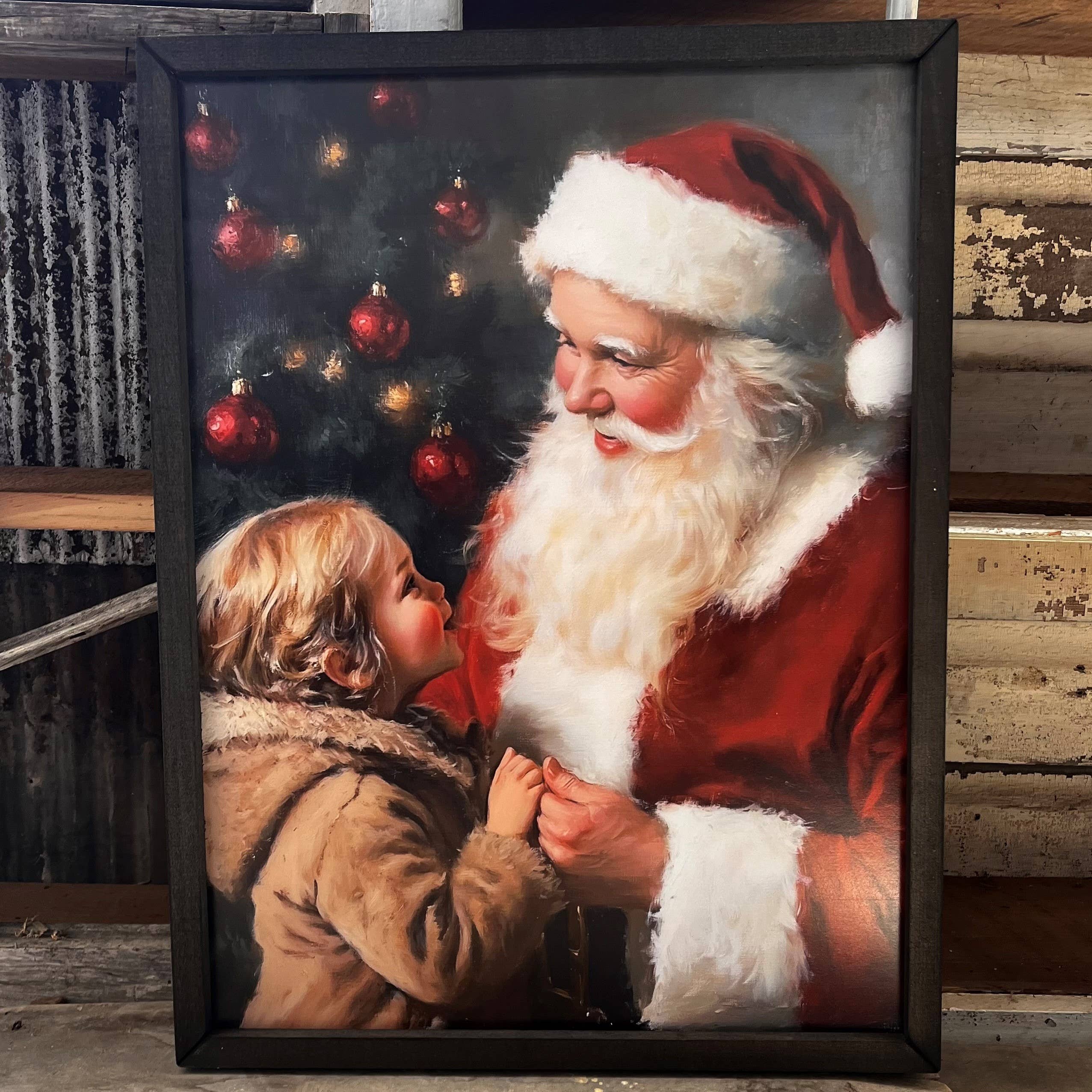 Cette image s'appelle "Peinture Rétro du Père Noël". L'impression non encadrée mesure 12x16 pouces. Le cadre ajoutera environ un pouce de plus par côté. Il s'agit d'une image de style rétro du Père Noël, dont la tête semble peinte de manière charmante et légèrement vintage sur un panneau de bois blanc. Le grain du bois transparaît à travers le design, ajoutant de la texture et une sensation rustique et démodée à l'image. Le visage jovial du Père Noël est encadré par sa barbe blanche duveteuse et ses joues roses, avec une expression chaleureuse et amicale. Son chapeau rouge iconique, complété par une bordure blanche, repose sur sa tête, orné de feuilles de houx et de baies rouges vives pour une touche festive. Une petite cloche pend du pompon à la pointe de son chapeau, captant la lumière et ajoutant une touche de fantaisie. L'esthétique générale évoque une sensation de nostalgie et de confort, rappelant l'esprit traditionnel des fêtes. Choisissez la couleur de votre cadre en lattes pour personnaliser votre produit. Tous les cadres ont un fil vintage le long du haut du cadre pour un accrochage mural rapide et facile.
