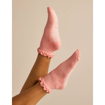 The Ruffle Grip Sock This crew-height style is topped with a delicate ruffle edge for just the right touch of style, and finished with our signature honeycomb grip coating to keep every move grounded. Sweet, strong, and ready to flow.