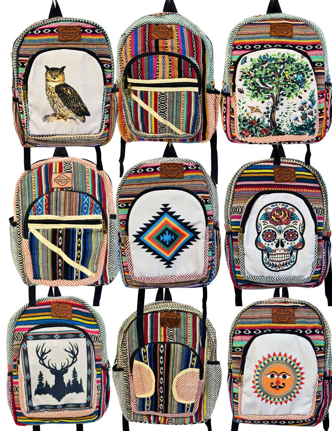 Our New Large Cotton Himalayan Backpacks in Bright colors & Vivid designs! Apx. 14" W x 18" H x 4" D with adjustable shoulder straps Fully Padded back panel inside the main compartment for laptops and tablets Two Water Bottle Pockets Shipped in an assortment For more Backpacks CLICK HERE For Purses & Bags Click Here