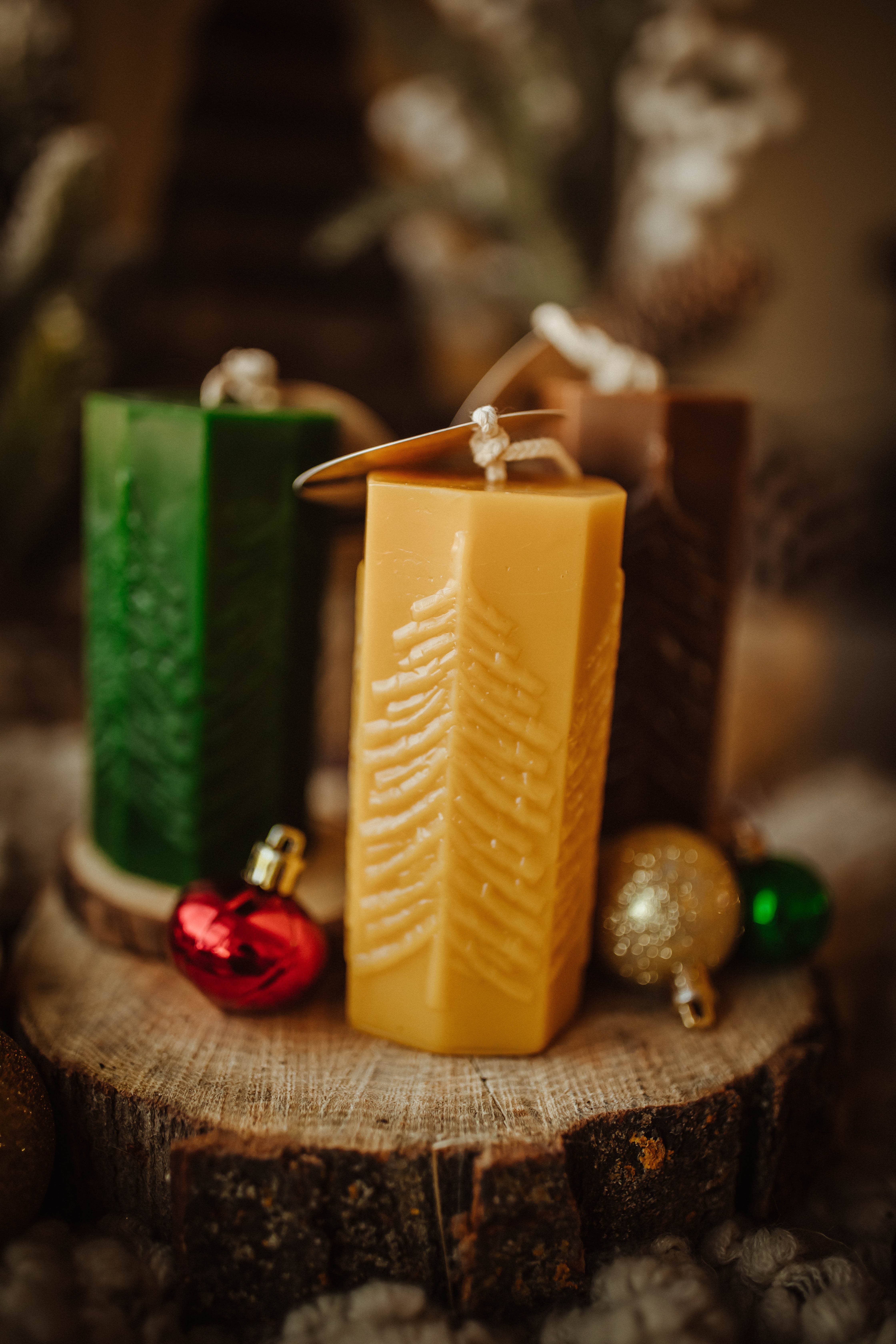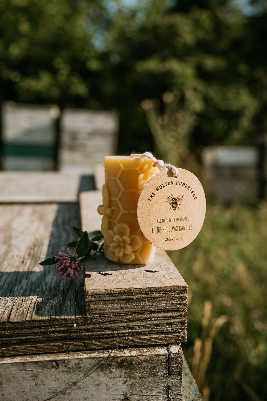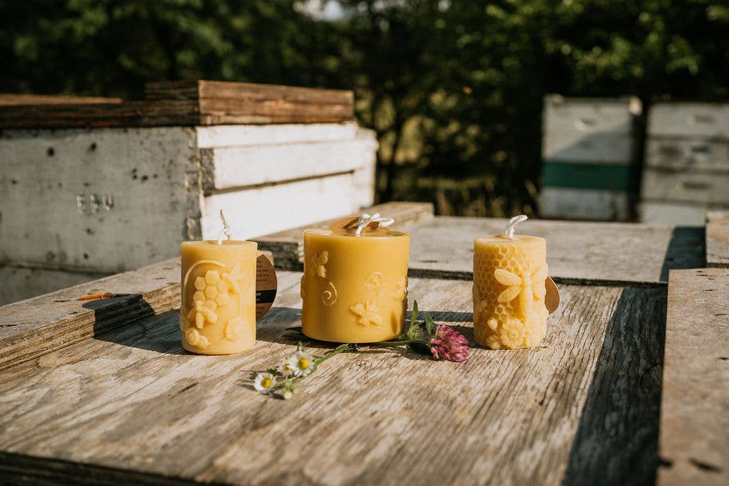 Pure beeswax candles from our beehives to your home. Did you know as beeswax candles burn, they pull toxins as they ionize the air? Negative ions bind with toxins which helps remove them from the air providing a cleaner environment for you and your family. Beeswax candles burn cleanly and have no added fragrances or colorings. Our beeswax candles are made with cotton wicks. They are slow burning with a natural mellow honey smell. 2” diameter 2.5” tall Burn time: ~15hrs please note, beeswax is a natural product and the color can vary. All of our beeswax candles come with product info and instructions We strive to deliver quality craftmanship. If you have any questions about our products please don't hesitate to ask before ordering :)