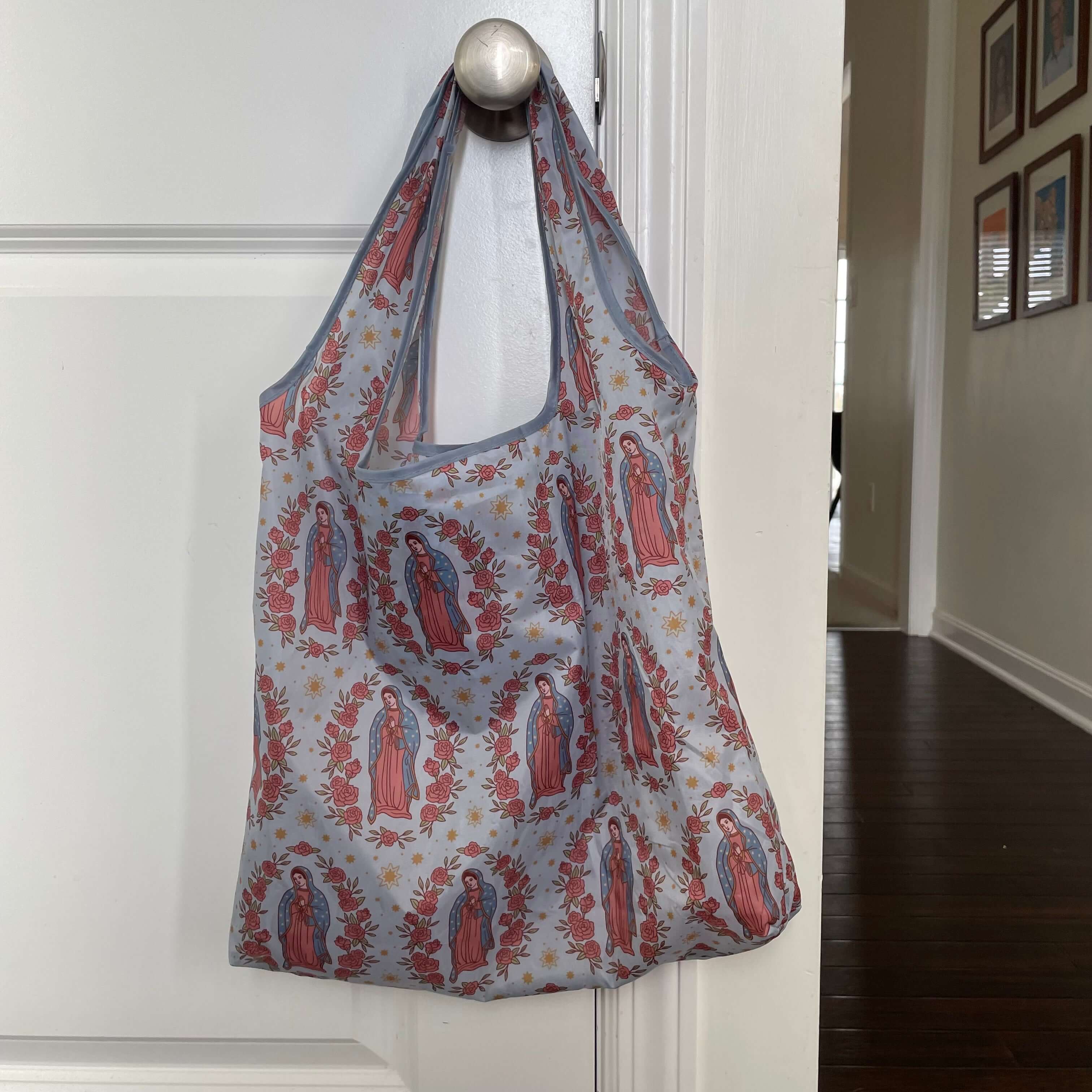 - In our daily efforts to care for God's creation, little changes can make a big impact. That's why I'm in love with our new Catholic Reusable Grocery Bags! 🌿 Crafted from sturdy 190T Polyester and sized at a generous 26.5 inches x 19 inches, these bags are a testament to both faith and practicality. With divine patterns like Lourdes, Guadalupe, Auspice Maria, Holy Hearts, and Eucharistic, running errands just got a touch more sacred. They're perfect for those of us in places where plastic bags are a thing of the past, and for anyone looking for a dependable, on-the-go option for shopping or daily tasks. At $12, not only are they a step towards being more environmentally conscious, but they also serve as a beautiful reminder of our call to stewardship – each purchase, a small act of love for our planet. Let's walk the talk of our faith with every trip to the market! Shipping - All in-stock items ship within 2 business days. Pre-orders ship in 2 – 3 weeks. Returns & Exchanges - We do not accept returns or exchanges for our Re-Usable Grocery Bags. Please contact us for more information. Social Media – Few things make me do a happy dance like when I see you ladies rock our products. Don’t forget to tag us @brickhouseinthecity. Thank you - Thank you for supporting our Catholic Small Business. This business blossomed from the simple idea that Catholic tees should be as trendy and vibrant as the women who wear them. We know your faith is important to you and we want to help you wear your faith on your sleeve. Your support helps our family to grow and our Catholic apparel business to expand and serve the beautiful people of our church.