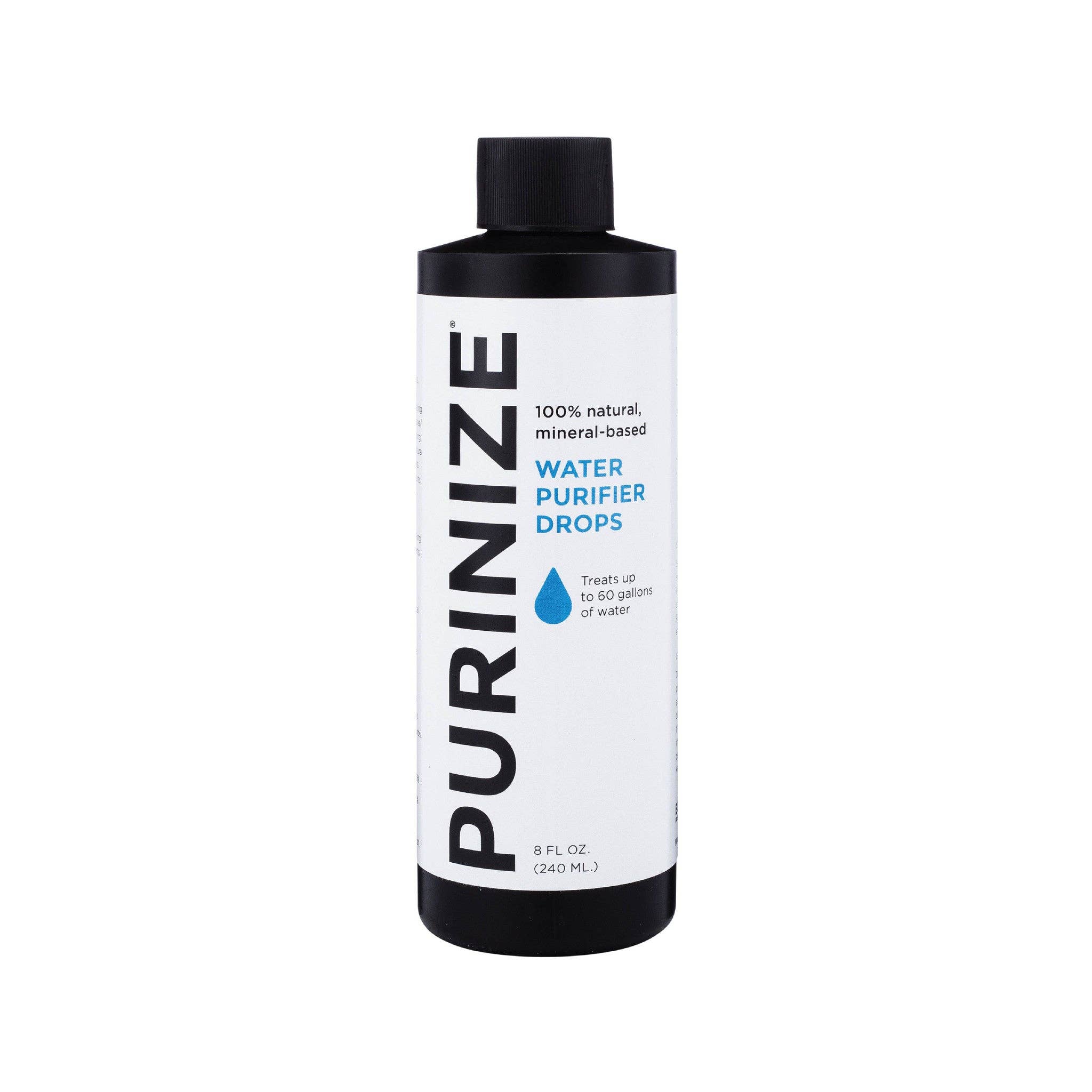 * DESCRIPTION * SPECS * DIRECTIONS * Treats up to 60 gallons of water. PURINIZE® naturally disinfects and clarifies water without harsh chemicals, making it safe to drink and use. Its 100% natural, mineral-based formula eliminates/reduces 200+ contaminants including bacteria, viruses, protozoan cysts, chemicals, heavy metals, pesticides, and more. GREAT FOR: outdoor adventure (e.g camping, hiking, fishing, kayaking) travel, emergency preparedness, boil alerts, water storage * * Active Ingredient/s: Sulfate Mineral Salts * Improves Taste & Odor: Yes * Removes Turbidity: Yes * Effective Against Microorganisms: Yes. Bacteria, viruses, & protozoan cysts. * Effective Against Chemicals & Other Contaminants: Yes. Industrial & agricultural chemicals, heavy metals, pharmaceuticals, volatile organic compounds (VOCs), disinfectants & disinfection byproducts. * Treatment Capacity: Treats up to 60 gallons (240 liters) of water. * Weight: 9.4 ounces * Dimensions: 6.4" H x 2" B * Wait Time: 60 minutes * Shelf Life: Unlimited, when properly stored. * Made in the USA * Tested according to EPA & NSF/ANSI standards (when applicable). * U.S Patent: 4,776,963 * * Add 20 drops per quart (liter) or 1 tsp. per gallon of water. * Shake/stir well & let stand for at least 60 minutes. (Depending on water quality, additional drops & wait time may be needed for best purification results. * Strain water through a regular water filter, coffee filter, or cloth to remove particulates. * Water is now ready to drink or use for brushing your teeth, washing your hands/face, washing/cleaning your food. PRODUCT FEATURES * Improves health, taste, odor & clarity of water. * 100% non-toxic. Free of chemical disinfectants like chlorine, chlorine dioxide & iodine. * No bad-tasting chemical aftertaste. * Safe for anyone to use on a daily basis including kids, pregnant women, and even pets. * Easy-to-Use * Eliminates/reduces 200+ contaminants including pathogens, agricultural & industrial chemicals, heavy metals, pharmaceuticals, disinfectants, & disinfection byproducts. * Eco-friendly. No human, animal, or environmental hazards. * Won't lose potency after opening. * Treatment has an unlimited shelf life when stored properly. * Made in the USA.
