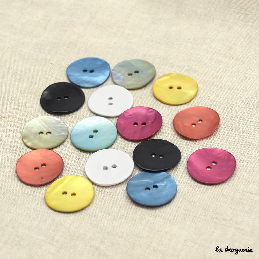 Round button with two holes, made of natural-colored mother-of-pearl shell. It is chic, understated, and timeless. The little basic! Easy-to-sew button for all your clothes. Akoya buttons (natural mother-of-pearl shell) Size: 18 mm Color: Natural Made in France Care advice: Before dry cleaning your garment, it is advisable to remove the buttons. If you machine wash them, wrap them in household aluminum foil, wash the garment inside out to avoid shocks, no soaking, gentle spin, hang without delay. What is Akoya? A type of oyster, it is a naturally iridescent and pearly shell found in Japan.