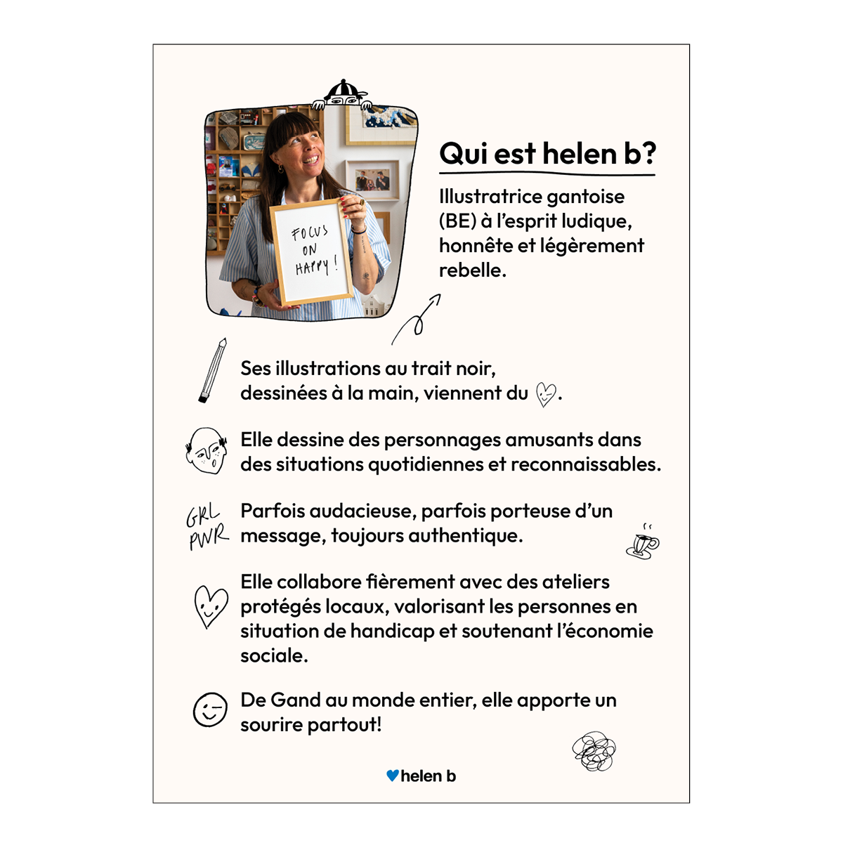 Benvenuti nell'universo di Helen B. Una meravigliosa visione del mondo, illustrata da Helen Blanchaert. È il suo universo pieno di personaggi e citazioni che vogliono rendere la vita quotidiana un po' più piacevole. Il filo conduttore della collezione sono le creazioni in uno stile di disegno tipico che rallegrano la giornata. Che sia su porcellana, tessuto o carta è irrilevante. Il tuo sorriso, è per questo che lo facciamo! La collezione è stata realizzata nel modo più locale e sostenibile possibile, nel rispetto delle persone e della natura. helen b collabora con partner regolari, fornitori e un laboratorio sociale a Gand da più di 8 anni, dove monitoriamo attentamente la produzione e la spedizione dei nostri prodotti. In questo modo, contribuiamo anche all'economia sociale. Onesta, trasparente e felice: questa è helen b.
