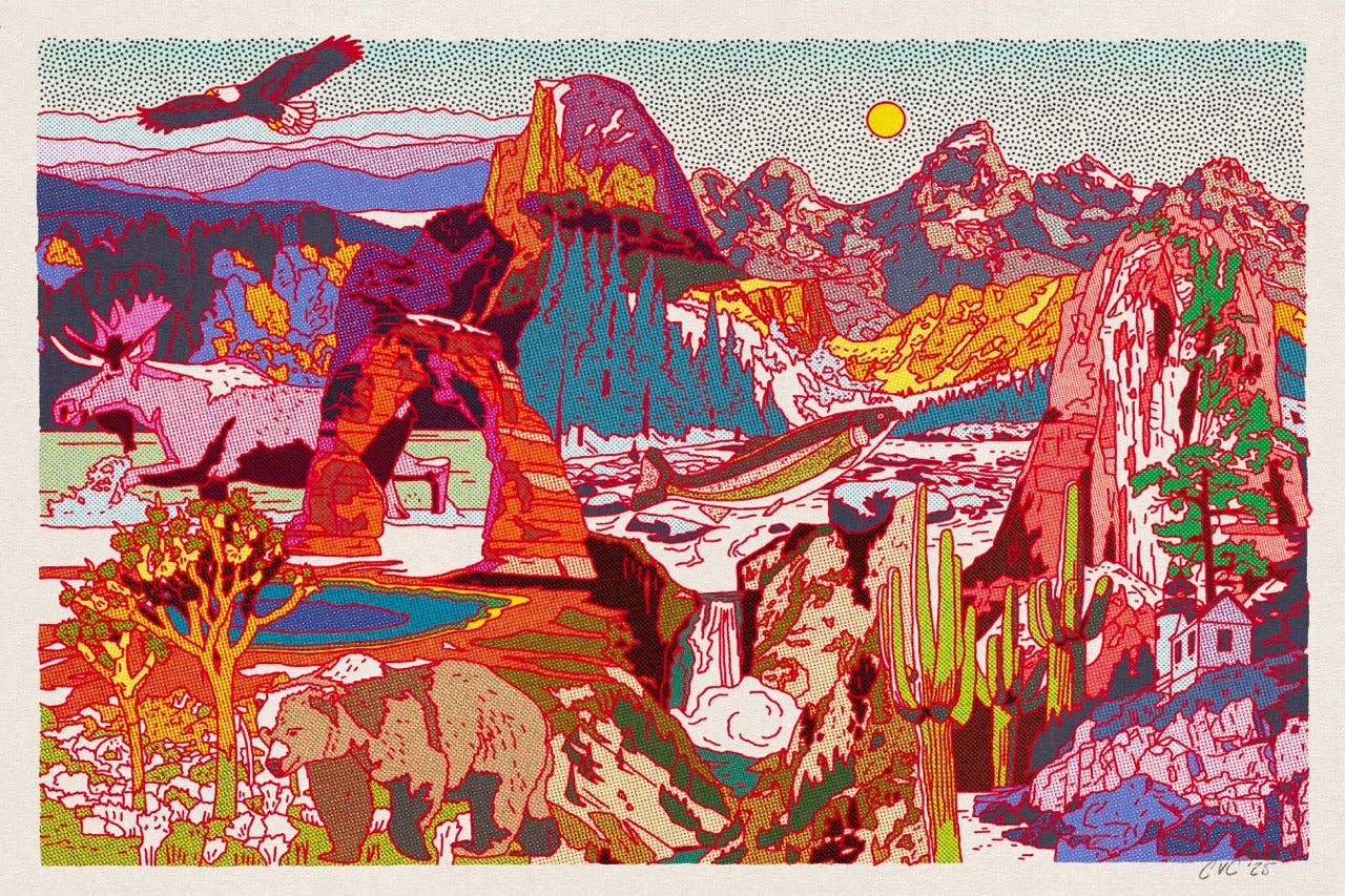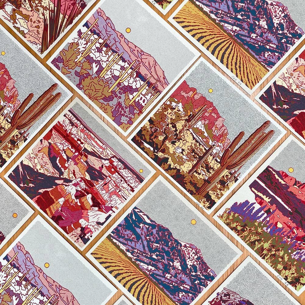 Come ex arrampicatrice competitiva diventata mamma impegnata che vive in Colorado, trovo ispirazione nei paesaggi aspri del West americano. Utilizzando tecniche digitali, creo stampe vivaci ispirate al vintage che catturano l'essenza delle montagne, dei deserti e della natura. Traendo spunto dalle mie esperienze come designer di merchandising per alcune delle tue band preferite e marchi di abbigliamento outdoor, cerco di infondere nelle mie opere un senso di avventura ed esplorazione che ricorderà agli spettatori i loro ricordi all'aperto preferiti. Sono anche entusiasta di collaborare con The Mayfly Project donando l'1% di tutte le vendite alla loro missione di tutoraggio dei bambini in affidamento attraverso la pesca a mosca e l'educazione all'aperto! Sebbene il mio mezzo principale sia il digitale, sperimento anche con la serigrafia e la creazione di modelli, aggiungendo strati di profondità e consistenza ai miei pezzi. Gioco sempre con nuove tecniche di creazione.