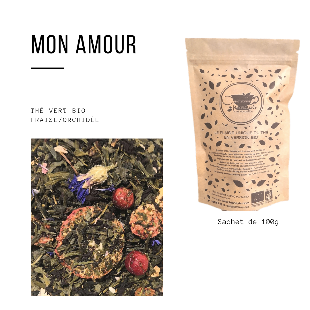 IL PIACERE UNICO DEL TÈ BIOLOGICO. Teanayis è nato a novembre 2014 a Montpellier. Tutti i nostri tè sono certificati biologici, realizzati solo con le migliori varietà di tè, frutta secca, piante, spezie e talvolta aromi naturali (estratti vegetali). Tutti i nostri tè provengono da agricoltura biologica controllata. Questo si distingue per la totale assenza di fertilizzanti e prodotti fitosanitari chimici. I nostri tè biologici provengono da aree in cui l'uso di pesticidi e altri prodotti chimici è severamente vietato. I criteri di selezione sono dettati dall'Unione Europea.