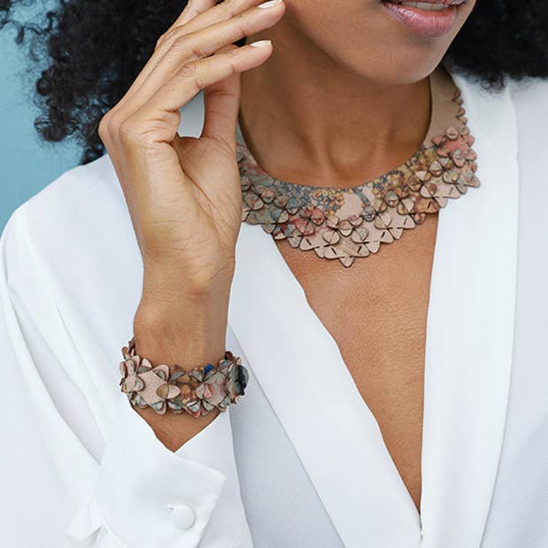 Iris Nijenhuis è una designer con sede ad Amsterdam con la passione per il taglio laser e un grande interesse per forme e strutture sperimentali. Si è laureata all'Amsterdam Fashion Institute con una collezione di tessuti e pezzi unici che sono emersi da un'ampia ricerca sull'uso di tecniche innovative. Sperimentando il taglio laser ha sviluppato una tecnica in cui il tessuto viene tagliato in piccoli pezzi di puzzle che costituiscono la base del processo di progettazione, adatti a molte applicazioni come la sua innovativa collezione di gioielli. Tutti i disegni sono realizzati a mano nell'atelier Iris nella bellissima zona di Prinseneiland ad Amsterdam. I suoi modelli sono principalmente prêt-à-porter, ma puoi indovinare il tuo pezzo nei suoi laboratori fai-da-te nel suo atelier o a casa con lo speciale kit fai-da-te che ha sviluppato.