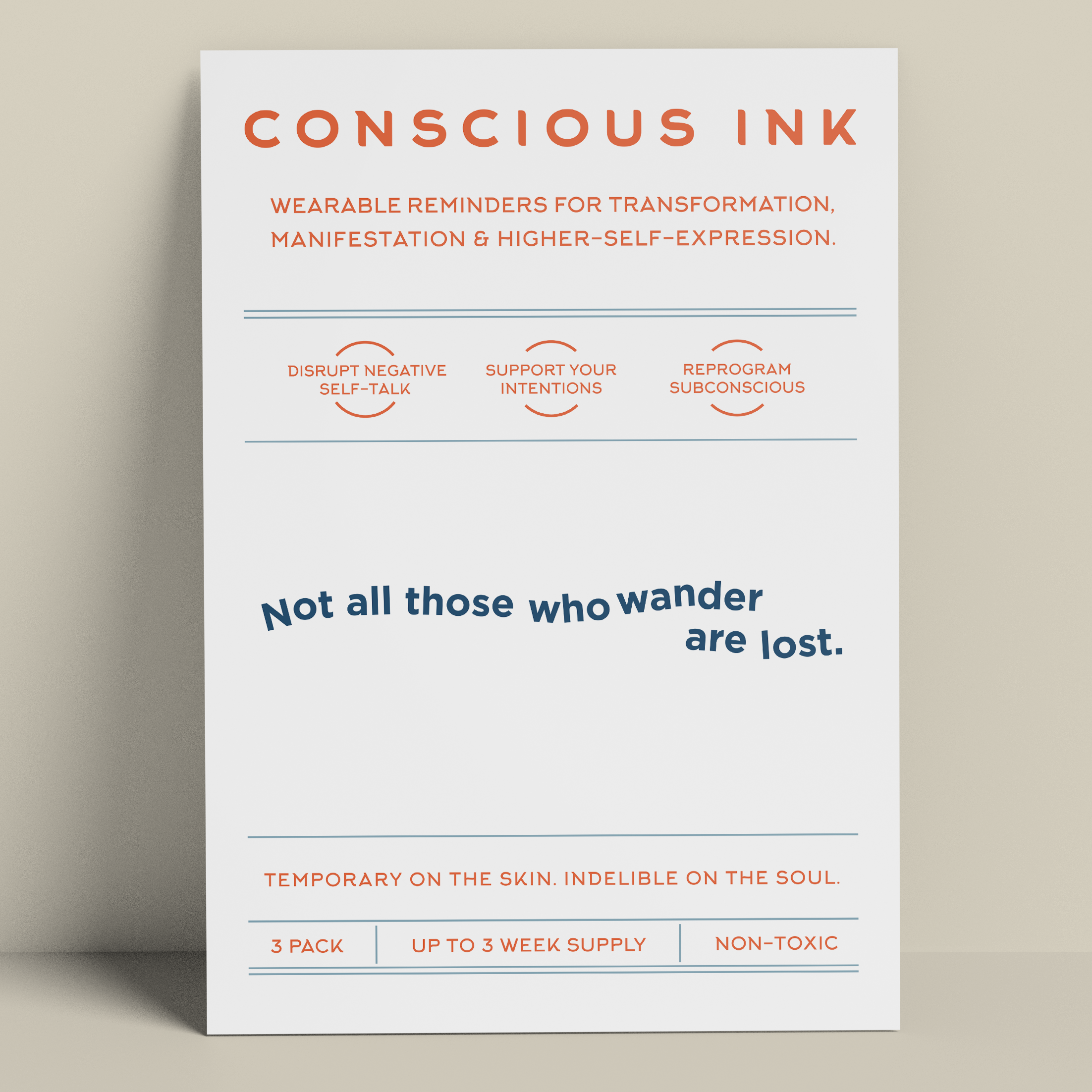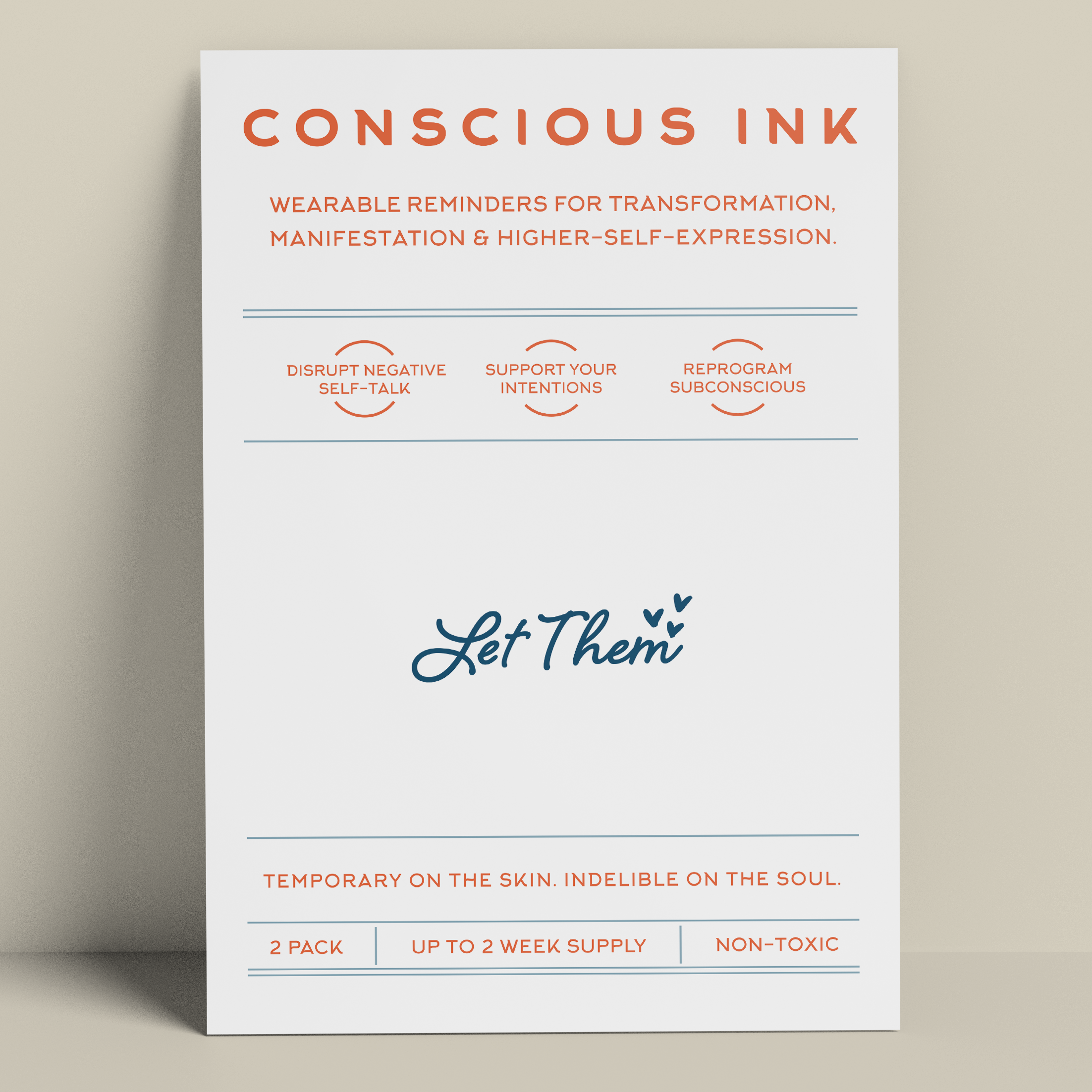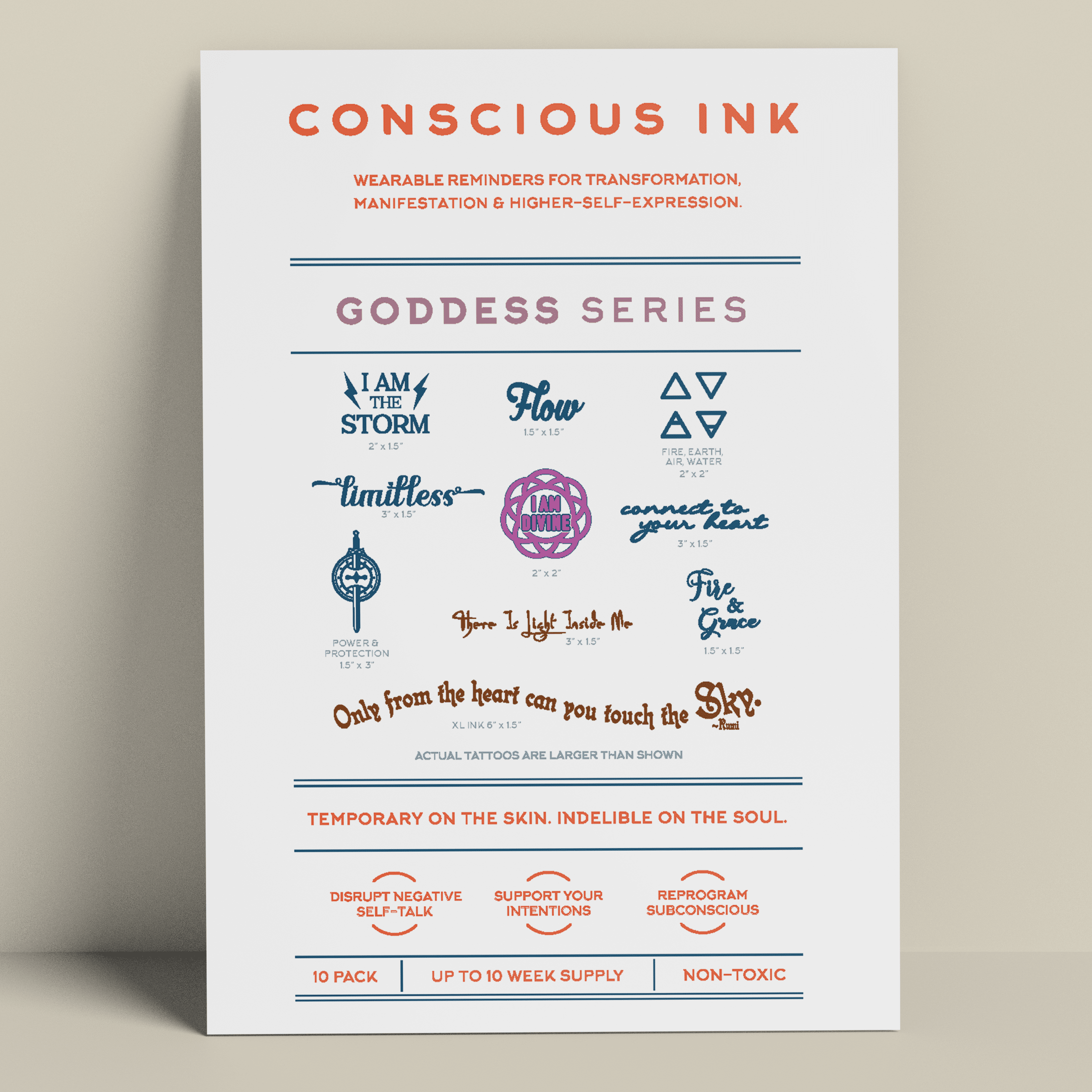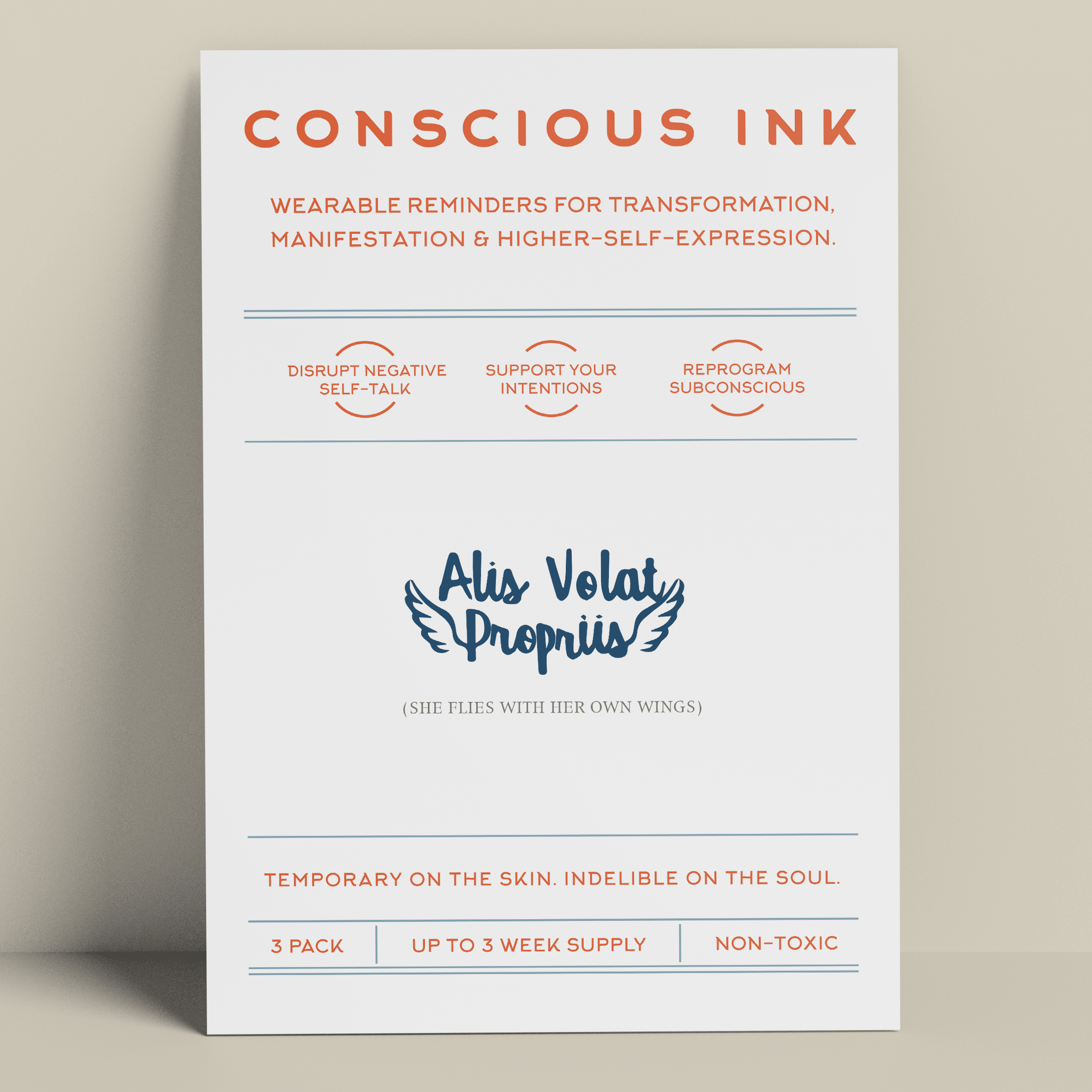 Fondata nel 2010, fondata da un esperto di sviluppo personale, Conscious Ink è la prima azienda in assoluto a utilizzare tatuaggi temporanei per aiutare le persone a realizzare le proprie intenzioni, sogni e desideri. Sorprendentemente potenti, i nostri tatuaggi temporanei Manifestation sono promemoria indossabili creati per interrompere il dialogo interiore negativo e i comportamenti controproducenti e per promuovere nuove abitudini di autoaffermazione. I risultati hanno persino cambiato la vita. Leggete le nostre recensioni! Ogni Conscious Ink dura in media 3-7 giorni (in base alla corretta applicazione, all'area di posizionamento, al tipo di pelle e al livello di attività). I Conscious Ink sono atossici, prodotti negli Stati Uniti con inchiostri di grado cosmetico certificati dalla FDA, che soddisfano o superano tutti i requisiti normativi statunitensi, canadesi e dell'Unione Europea, compresi gli standard di sicurezza per cosmetici e prodotti giocattolo. CONSIGLI PER L'APPLICAZIONE, L'USURA DURATURA E LA MANIFESTAZIONE 1.