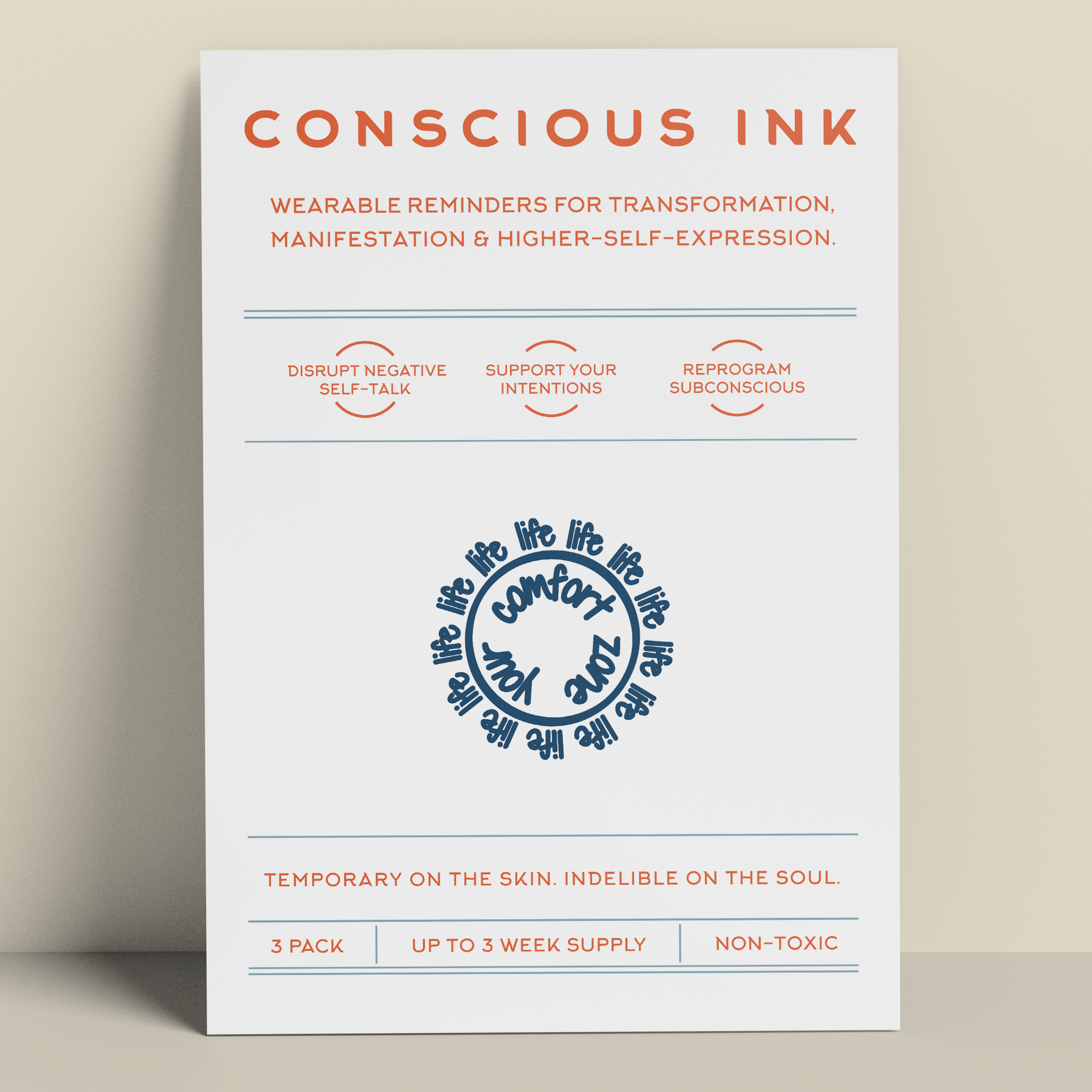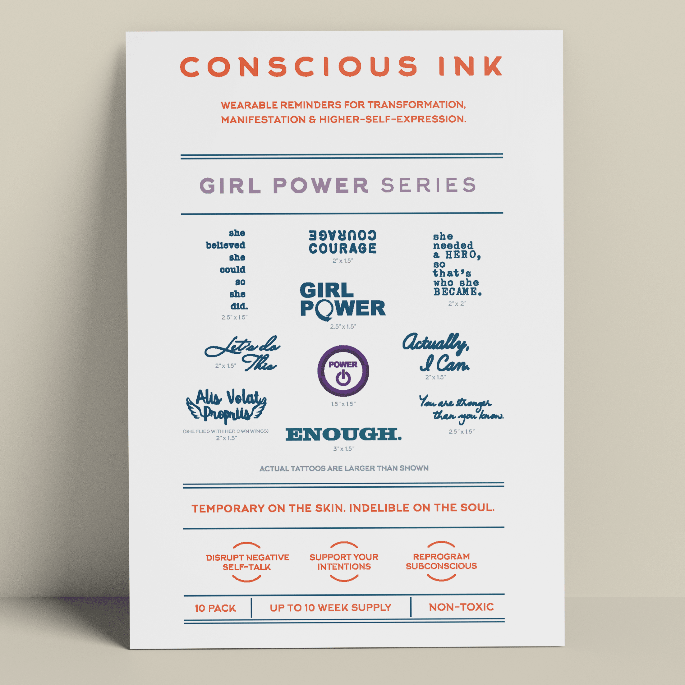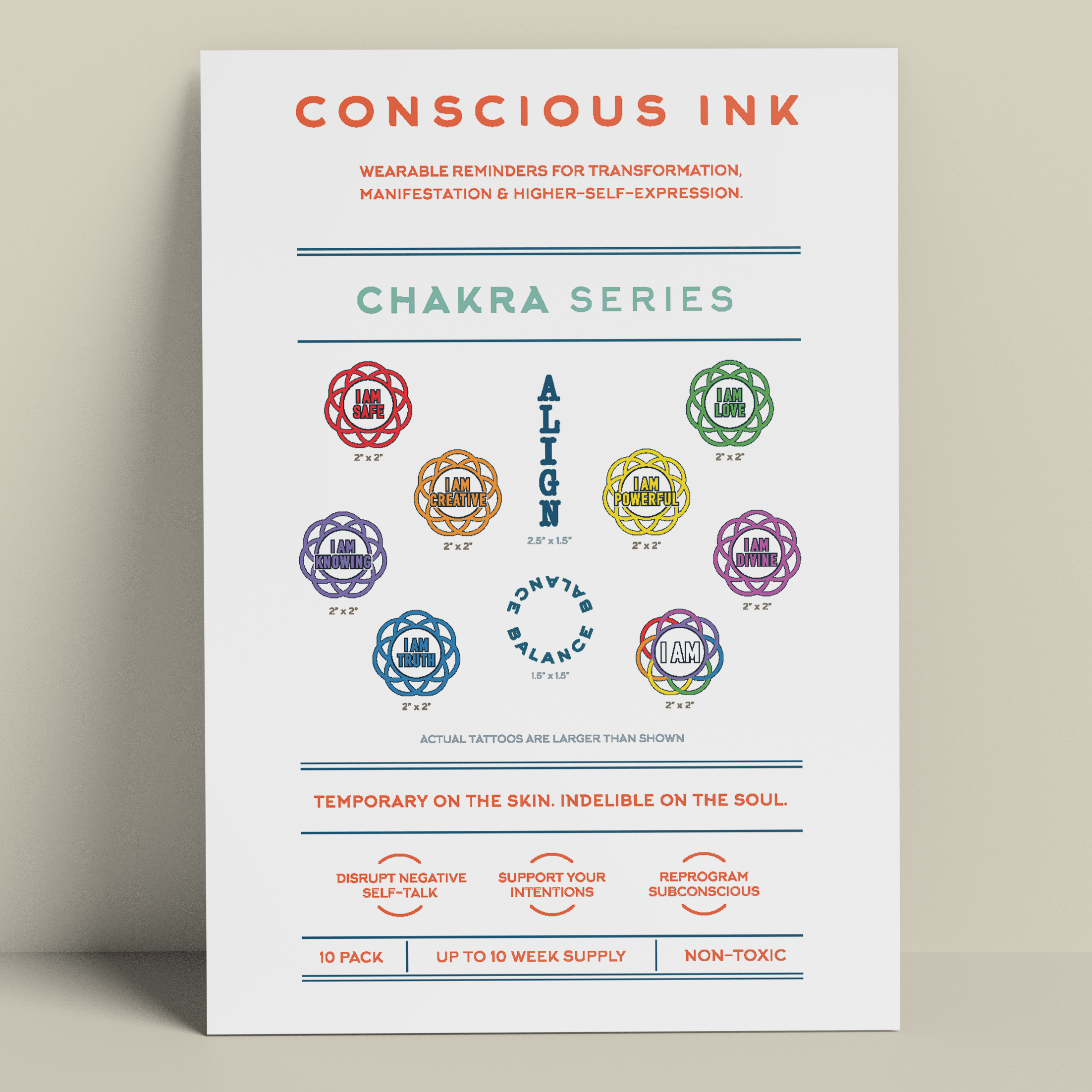 Fondata nel 2010, fondata da un esperto di sviluppo personale, Conscious Ink è la prima azienda in assoluto a utilizzare tatuaggi temporanei per aiutare le persone a realizzare le proprie intenzioni, sogni e desideri. Sorprendentemente potenti, i nostri tatuaggi temporanei Manifestation sono promemoria indossabili creati per interrompere il dialogo interiore negativo e i comportamenti controproducenti e per promuovere nuove abitudini di autoaffermazione. I risultati hanno persino cambiato la vita. Leggete le nostre recensioni! Ogni Conscious Ink dura in media 3-7 giorni (in base alla corretta applicazione, all'area di posizionamento, al tipo di pelle e al livello di attività ). I Conscious Ink sono atossici, prodotti negli Stati Uniti con inchiostri di grado cosmetico certificati dalla FDA, che soddisfano o superano tutti i requisiti normativi statunitensi, canadesi e dell'Unione Europea, compresi gli standard di sicurezza per cosmetici e prodotti giocattolo. CONSIGLI PER L'APPLICAZIONE, L'USURA DURATURA E LA MANIFESTAZIONE 1.