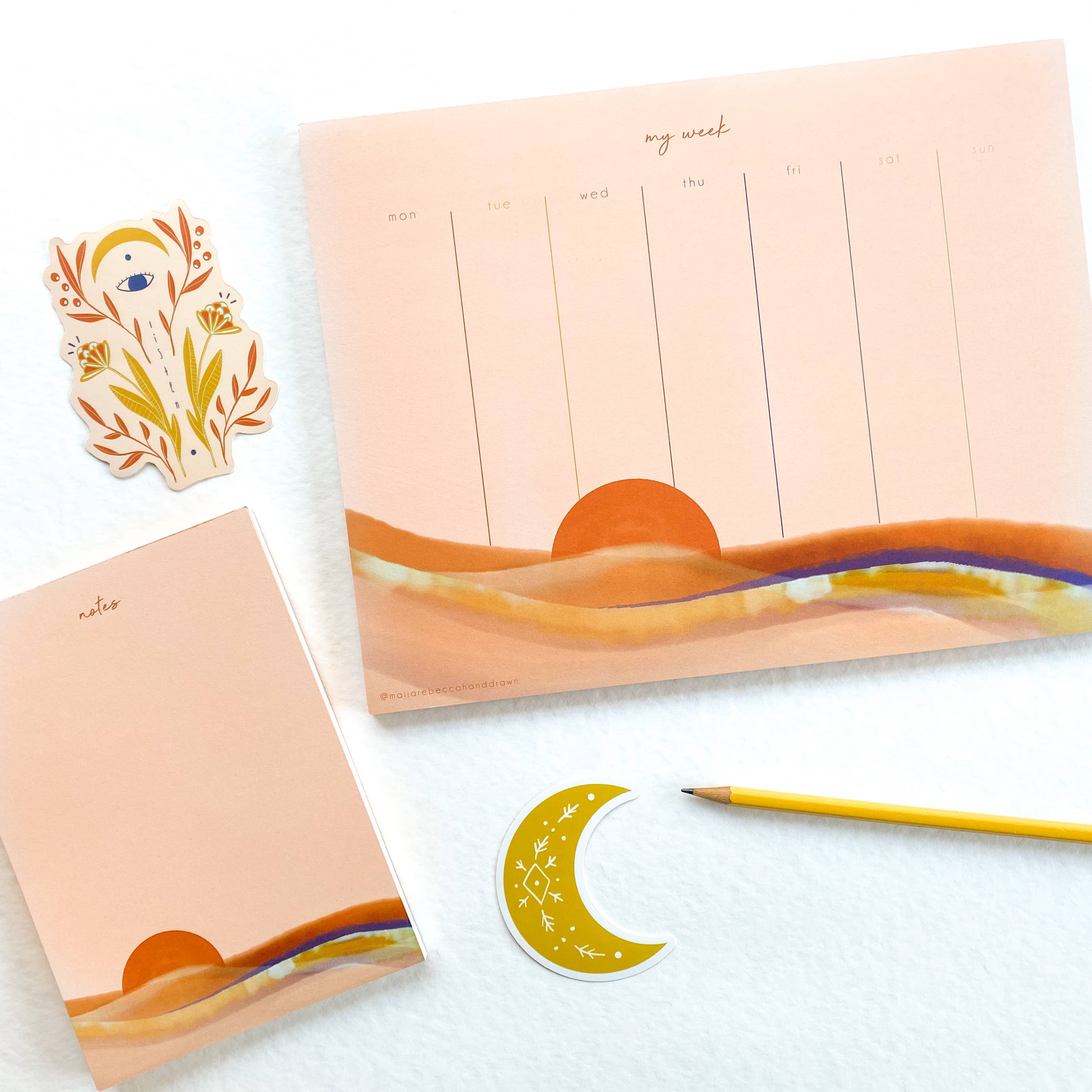 Maija Rebecca Hand Drawn è un'azienda di articoli di cartoleria di proprietà di una donna queer, gestita dall'artista dell'Oregon Maija Kellner-Rode. Traggo la maggior parte della mia ispirazione dalla magia che si trova nella natura, dalla misteriosa connessione che abbiamo con questo universo e tra di noi. La mia speranza è di creare arte che ispiri gli altri a connettersi con se stessi e con gli altri in modo più aperto, onesto e vulnerabile, diffondendo bellezza, amore e un po' di audacia in tutto il mondo. La mia linea comprende biglietti di auguri vivaci e colorati, adesivi, stampe artistiche, blocchi per appunti e agende.