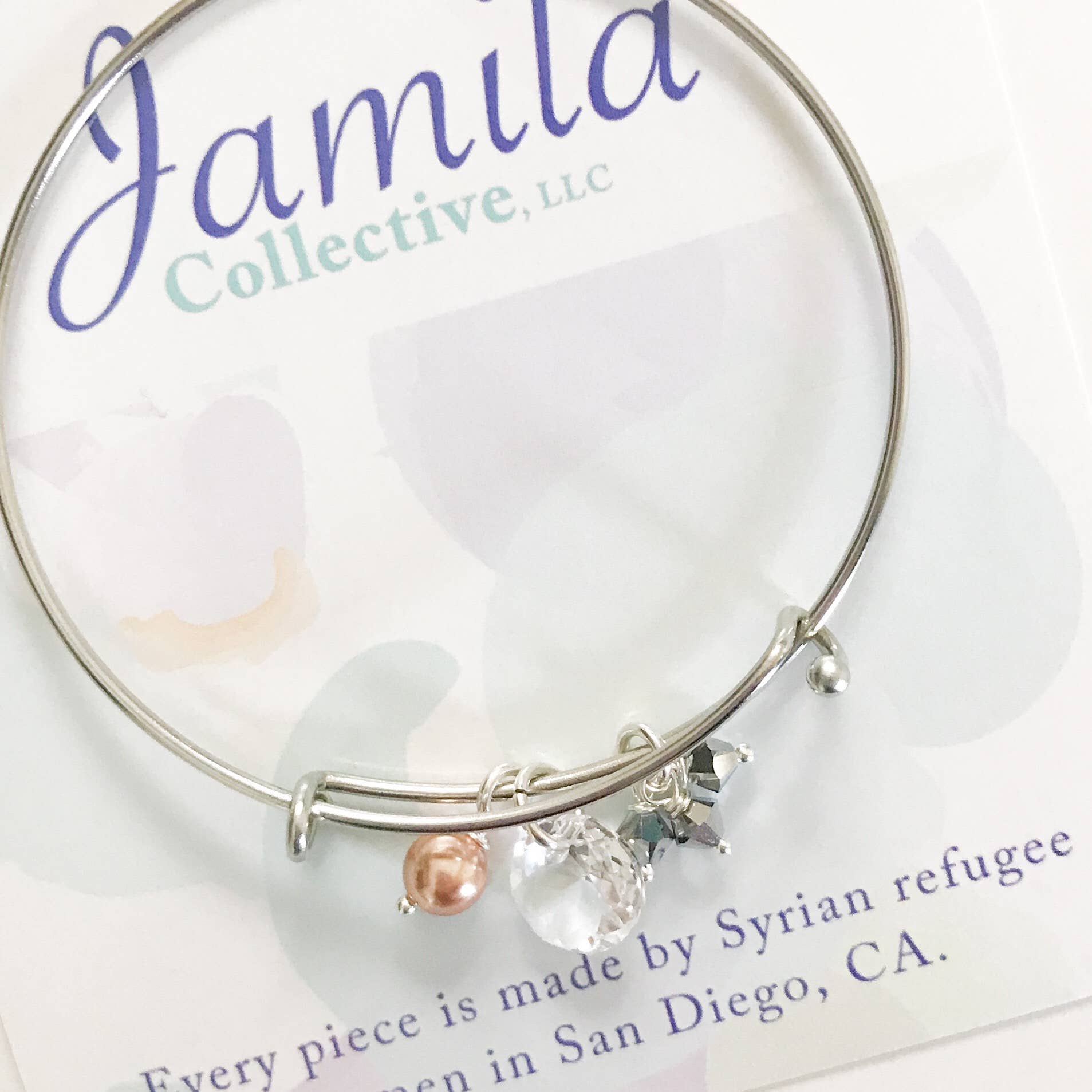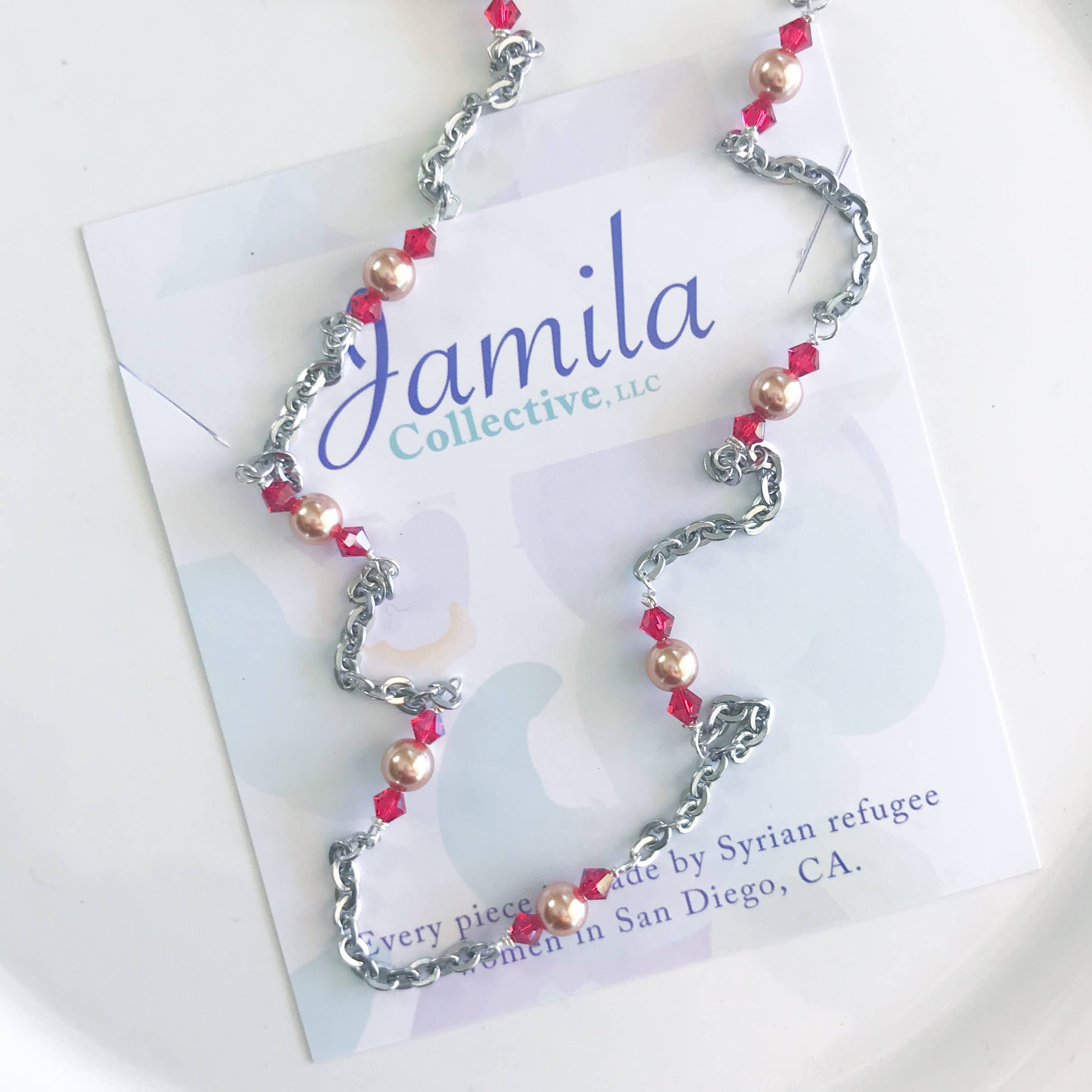 Dopo aver collegato con la comunità locale dei rifugiati siriani a San Diego all'inizio del 2017, la designer Megan Reynolds ha trovato «il suo popolo». Ora, le donne di queste famiglie di rifugiati devono entrare nella forza lavoro per la prima volta. Megan lavora con queste donne per sviluppare competenze e produrre tutti i disegni di gioielli per Jamila Collective. Si tratta di più di bei gioielli. Ognuno dei nostri cristalli Swarovski, perla, argento sterling e acciaio inossidabile è senza tempo, ma moderno. Il mix di acciaio inossidabile, perline scintillanti e perle luccicanti rende i nostri pezzi unici. Ogni pezzo prende il nome da un rifugiato siriano che Megan come incontrato. Ogni pezzo è realizzato da uno dei nostri quattro rifugiati siriani che attualmente lavorano con noi. Ogni pezzo viene fornito con una carta creatrice che racconta la storia delle donne che hanno realizzato il pezzo.